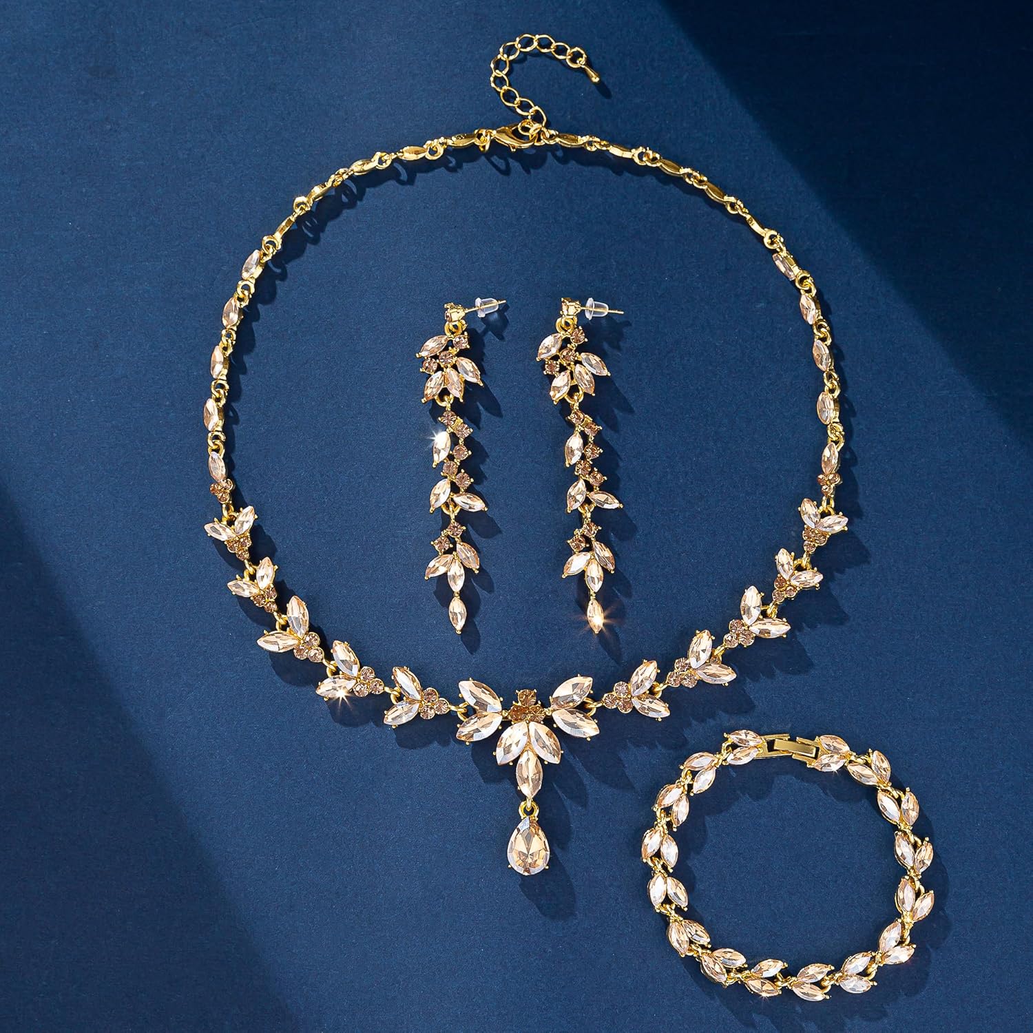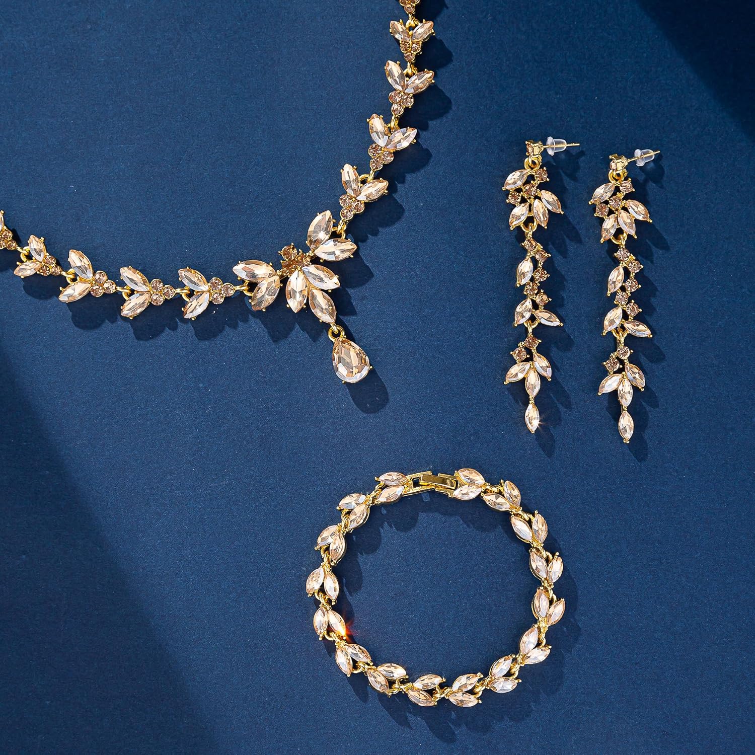 - Leaf design gold formal champagne diamond crystal necklace earrings jewelry set for women evening wear: Women champagne gala jewelry set is gift packaged, which is suitable for Wedding / Engagement / Valentines-day / Anniversary / Prom / Dinner party / Birthday party, any occasion you want to be more charming.