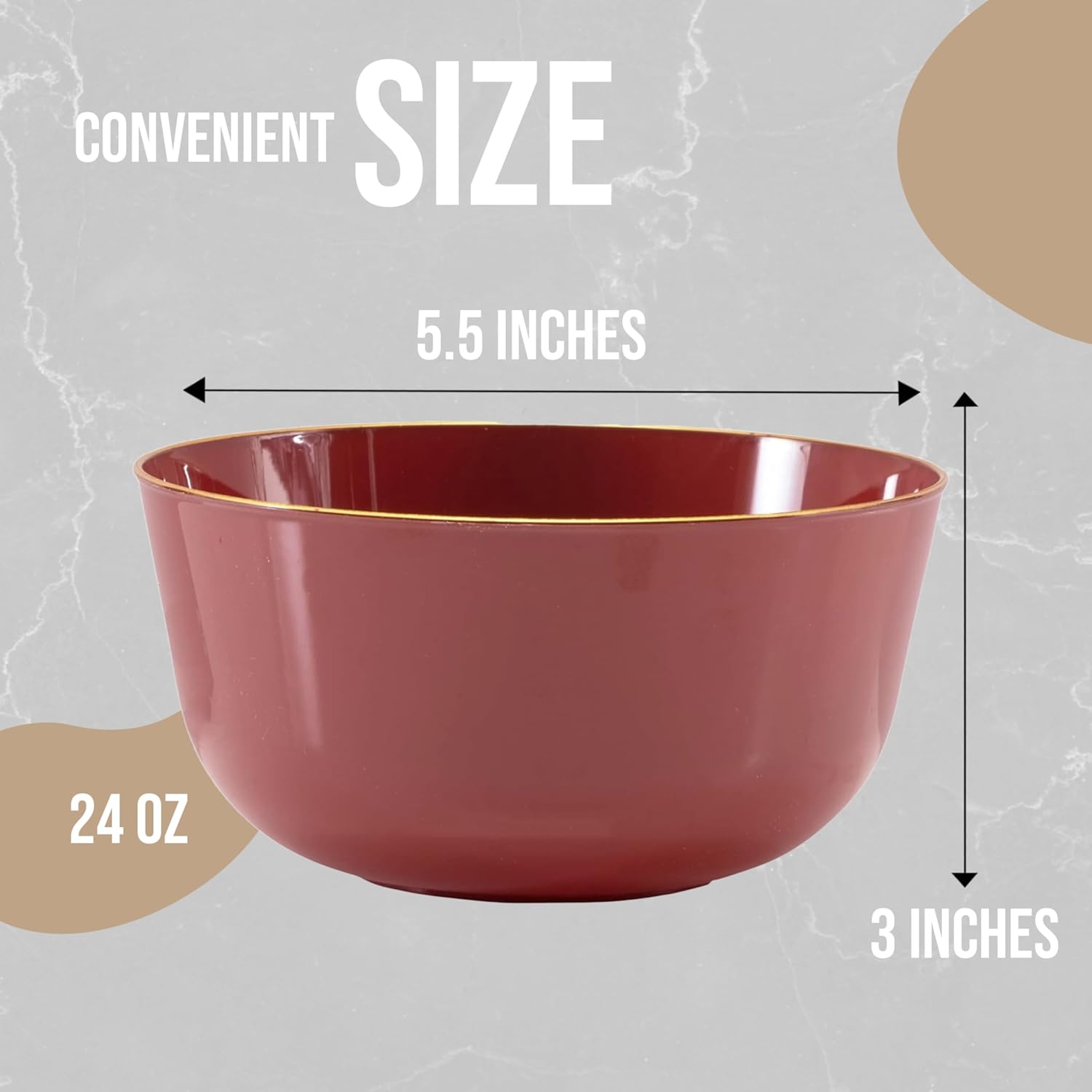 Trendables Burgundy & Gold Rimmed Disposable Bowls - 24 Oz Set of 20 Fancy Plastic Serving Bowls Perfect for Ice Cream, Salad & Candy