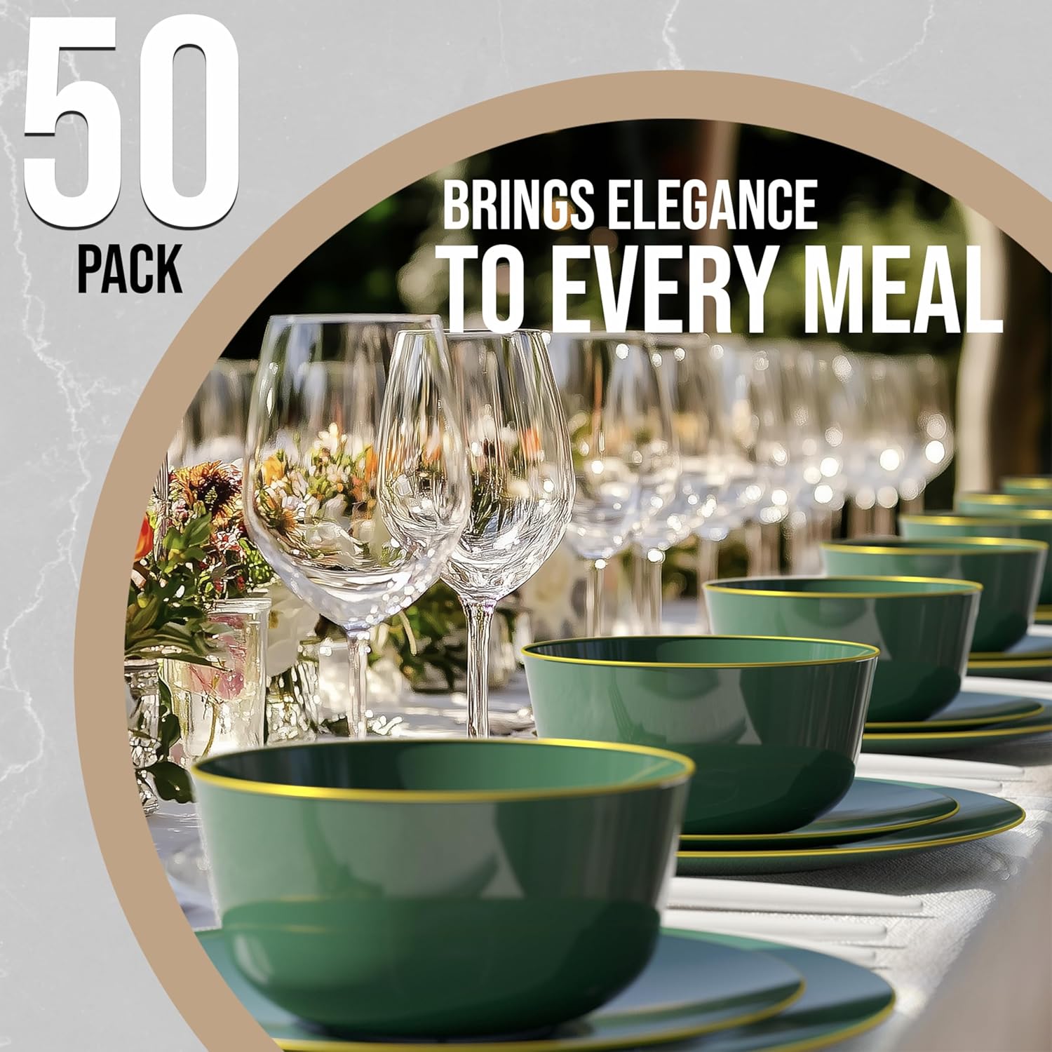 Trendables Disposable Bowls - 24 Oz Set of 50, Green Gold Rimmed Fancy Serving Bowls, Perfect for Ice Cream, Salad, and Candy