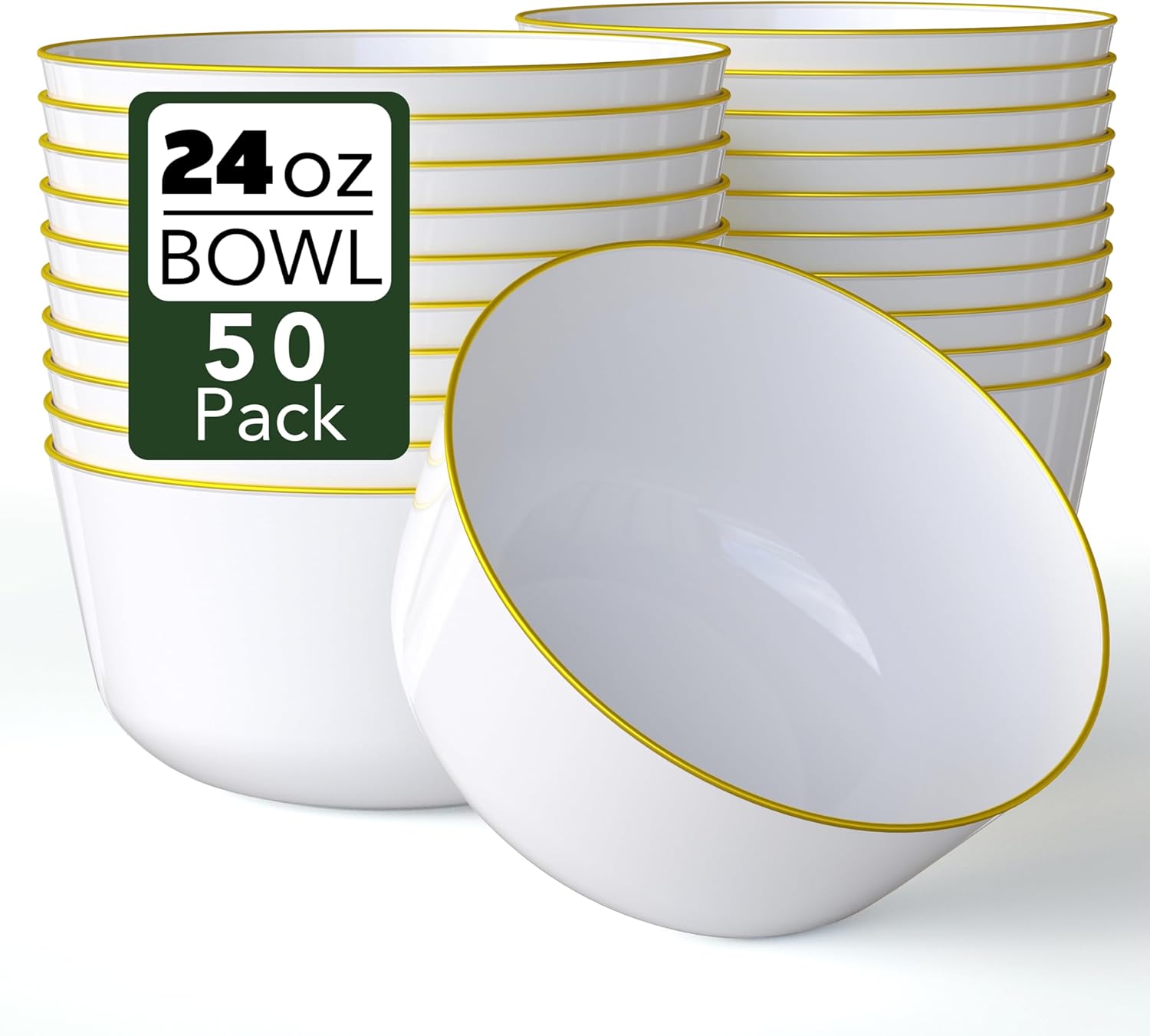 Trendables Plastic Bowls - Disposable 24 Oz Set of 50, White Gold Rimmed Fancy Serving Bowls, Perfect for Ice Cream, Salad, and Candy