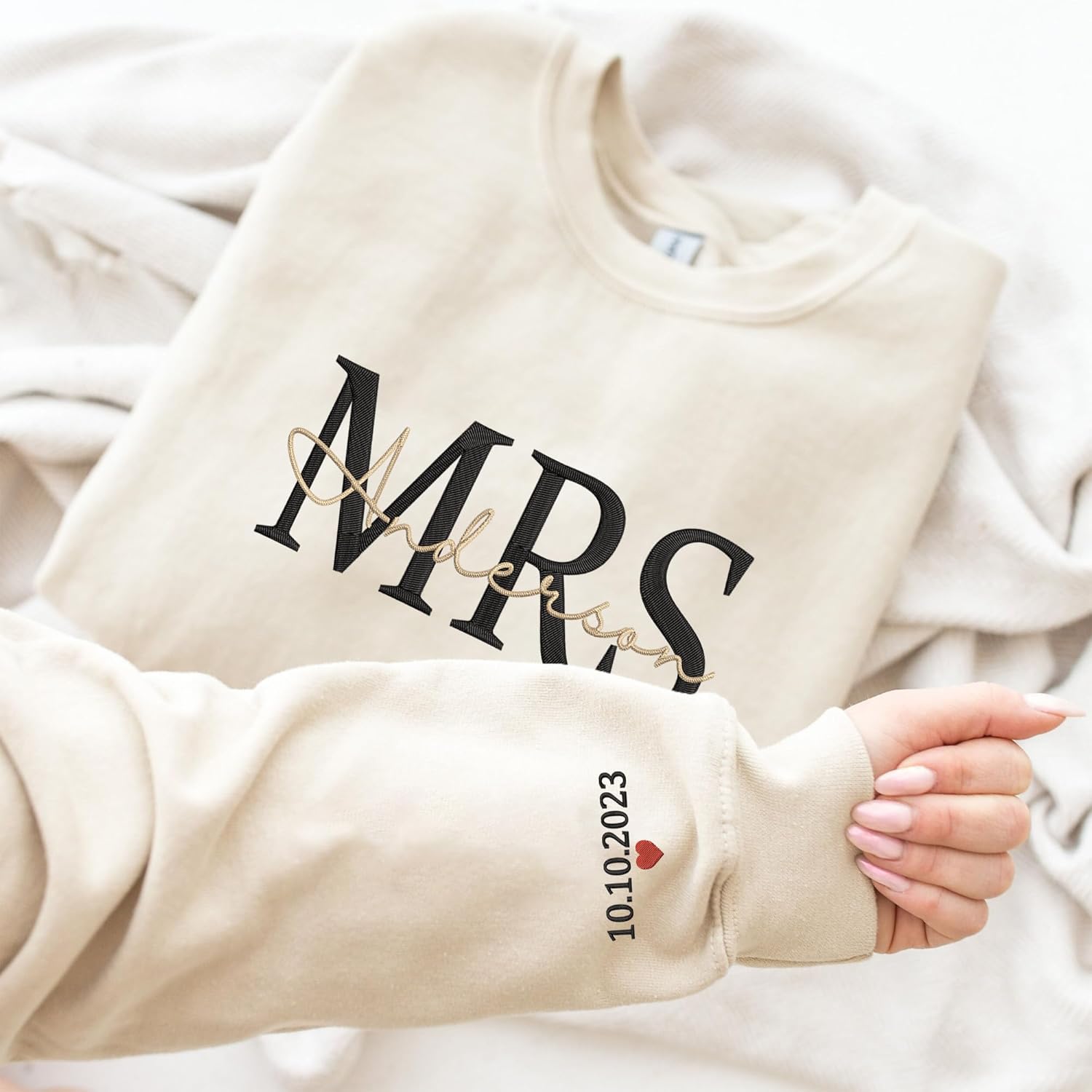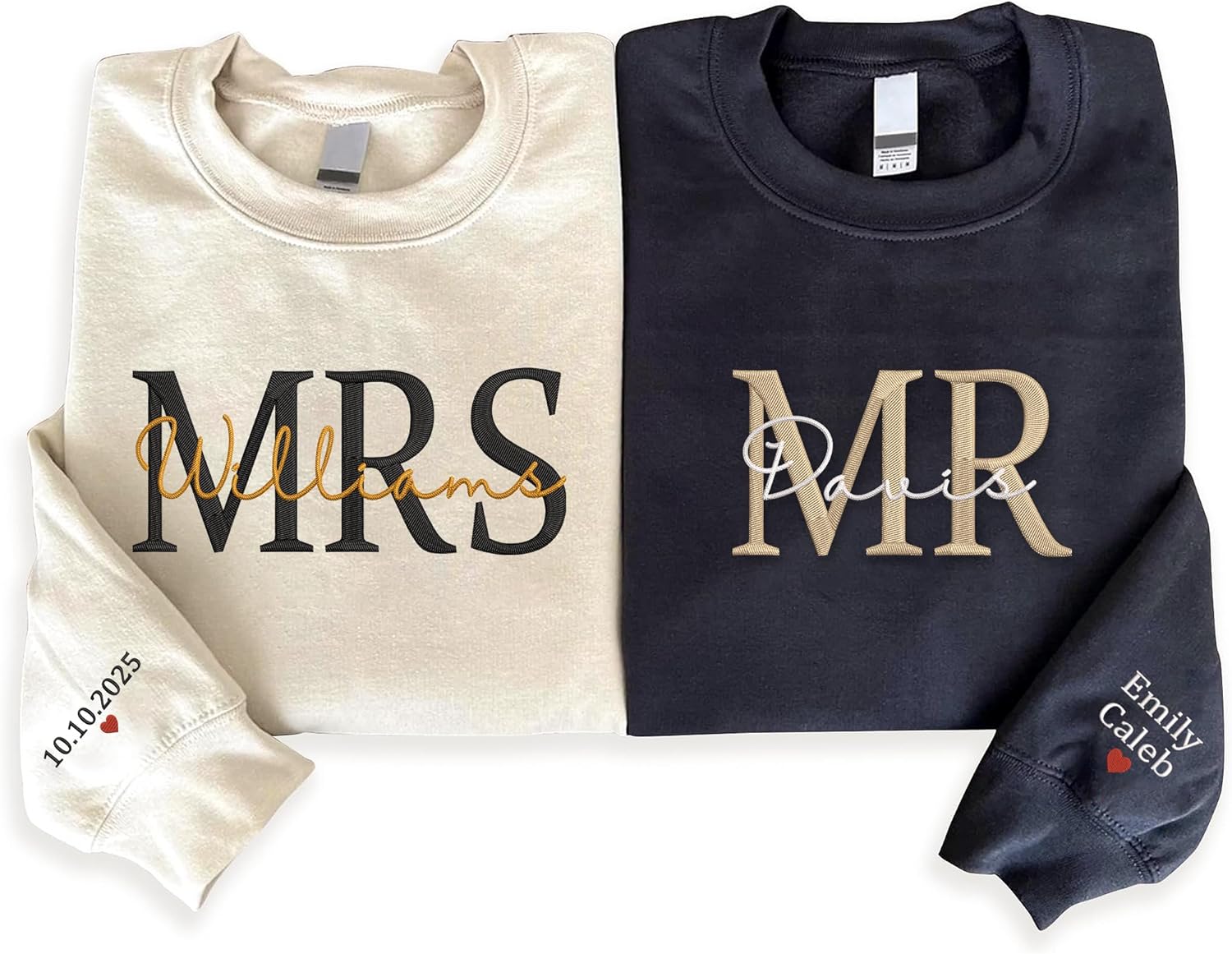 Custom Mr & Mrs Embroidered Sweatshirt โ Matching Couple Sweatshirt - Personalized Anniversary Date or Text on Sleeve โ Gifts for Him and Her, Wedding, Valentineโs Day, Christmas