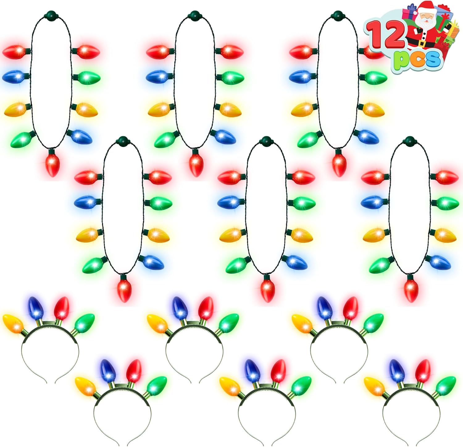 - Complete Set: Our Christmas 12PCS Set includes 6PCS LED light bulb necklace and 6PCS LED light bulb headband, each necklace has 9 light bulbs, each headband has 4 light bulbs. Perfect for adding a festive glow to your holiday events.