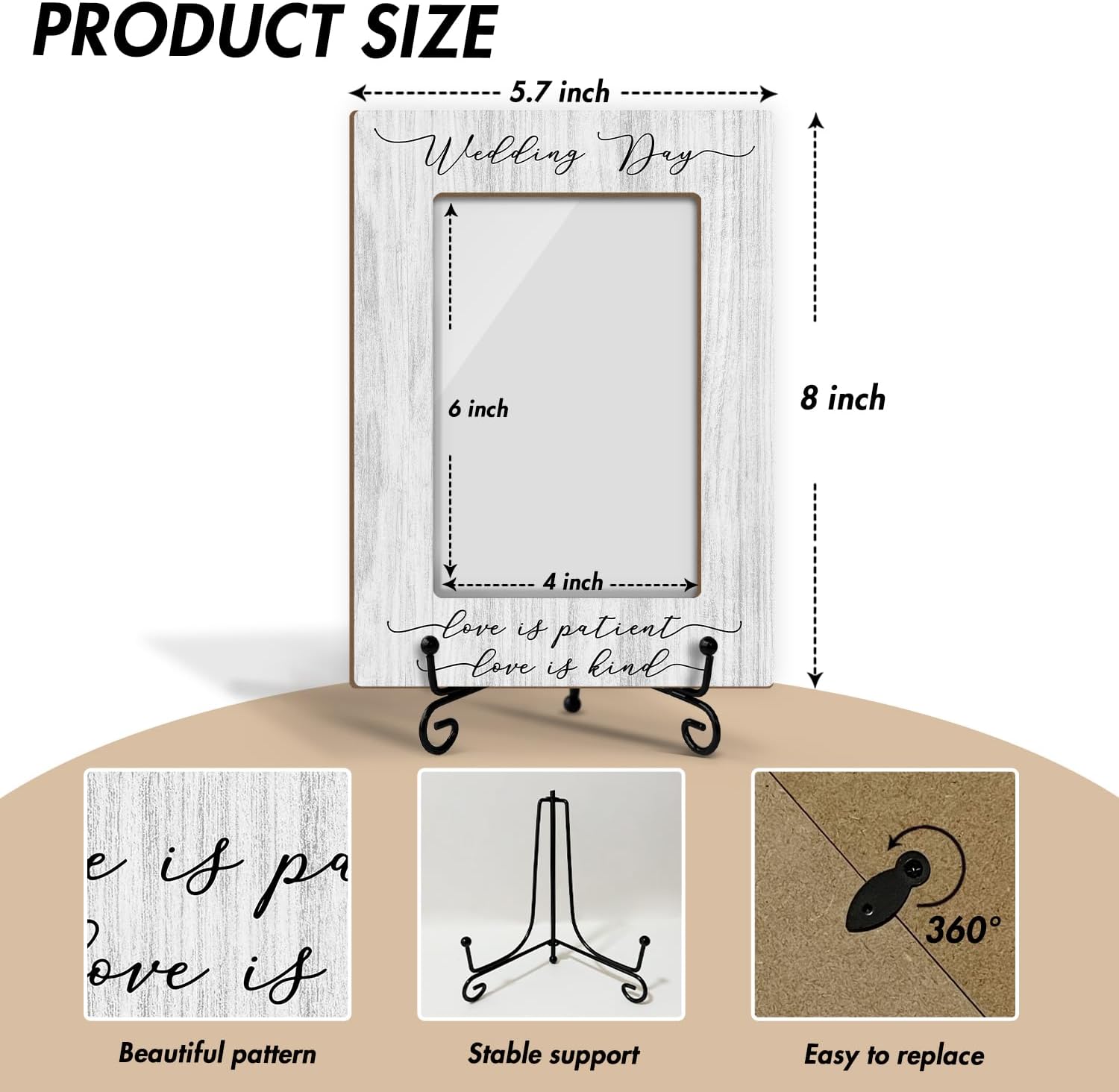 - Dimensions: You will receive a wooden photo frame approximately 8x5.7 inches holding a 4x6 inch photo with an iron frame to stabilise the frame on any flat surface.