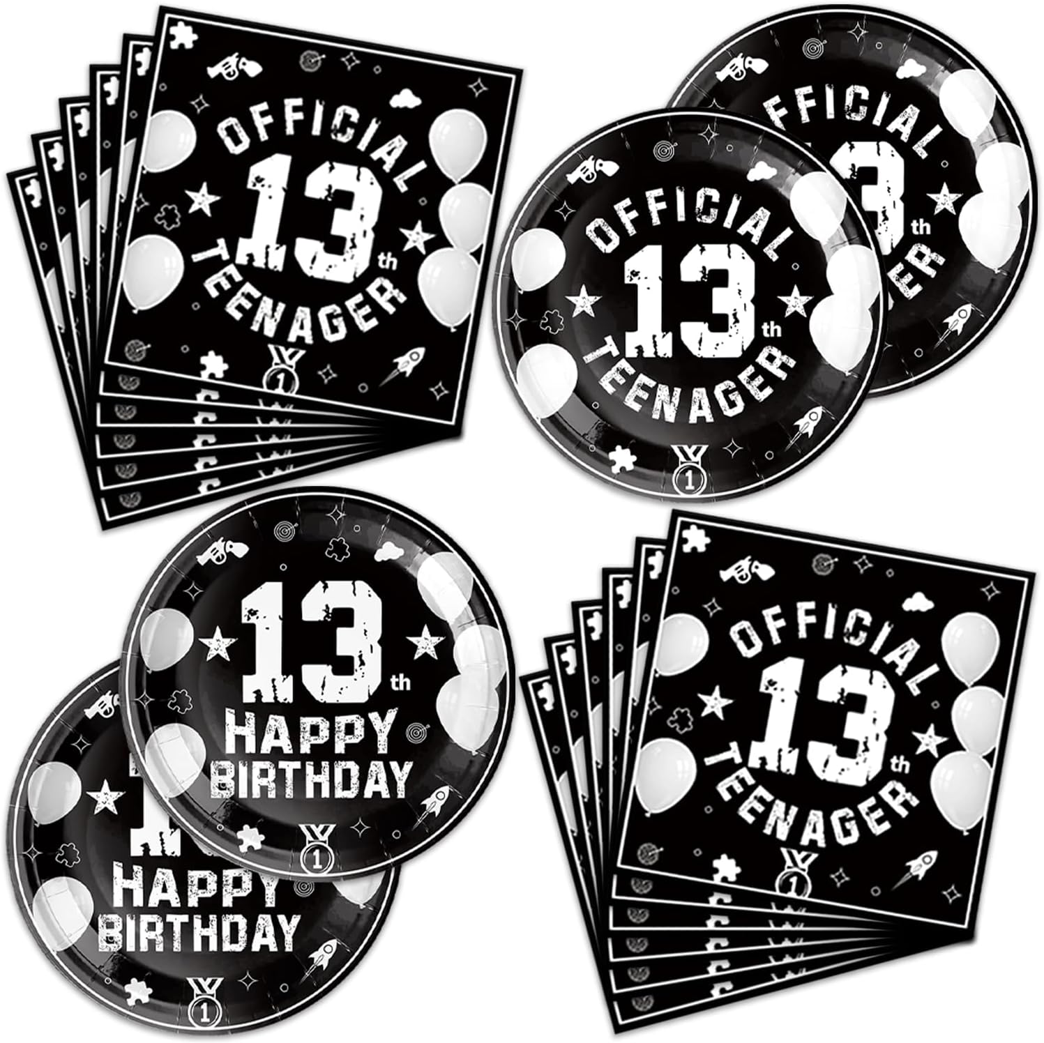 - [Unique Design]:These tableware are in black and white, a simple combination that never goes out of style, and the two colors look premium together with the balloon accents to make your party look premium and lively. If you have a 13th party coming up, then you definitely need this tableware