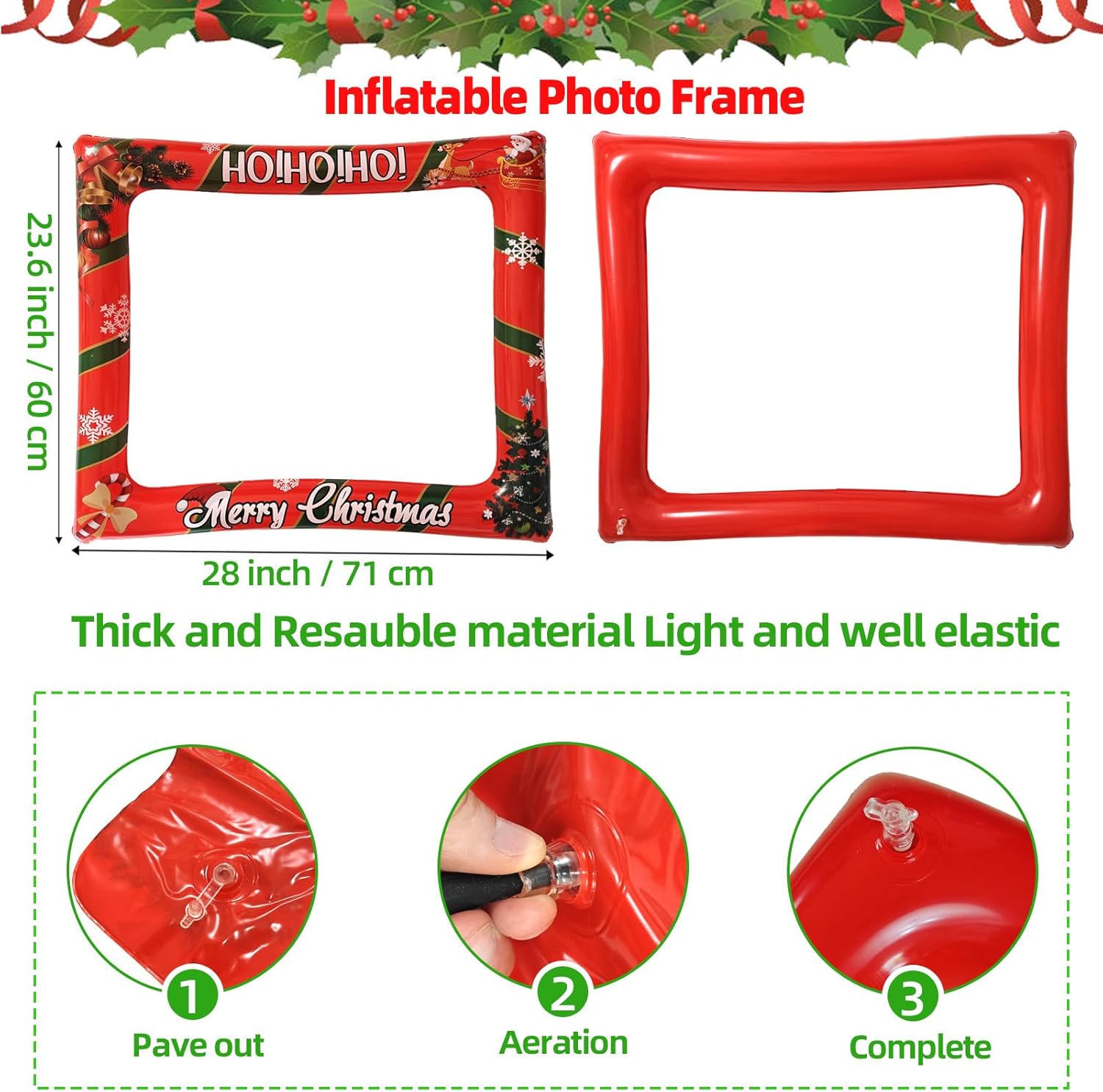 - Ideal for Selfie: Size of XMAS Photobooth pictures frame after inflating is 28x23.6inch(71x60cm) which is large enough for three people to selfie together. The material of photo booth picture frames is PVC which is thick but very lightweight, so the inflatable picture frame can stand up, reusable, safety for Children.