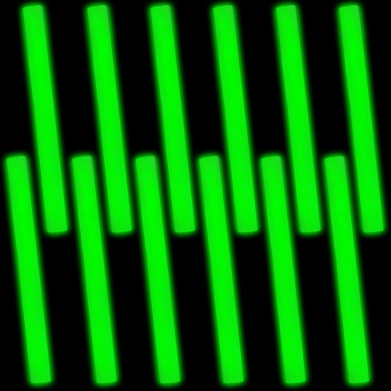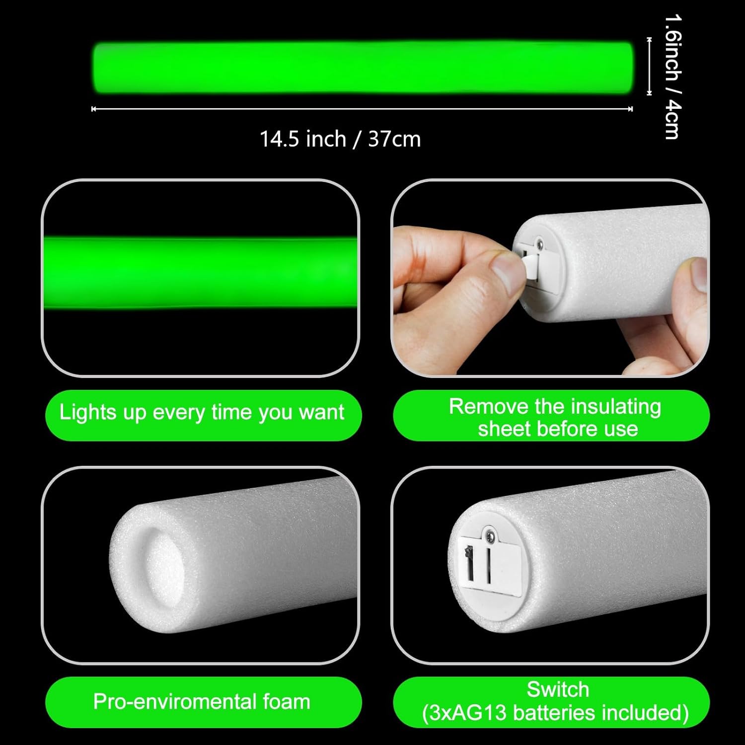 - Glow In the Dark Giant Foam Sticks: You will get 36 pack green light up foam glow sticks. Press the power button to switch between the 3 different light up modes: quick flashing, slow flashing and alternately flashing. These LED foam sticks boast vibrant colors, offering wider light coverage and ensuring the excitement party experience,bring tons of joy for you. Perfect for theme music festivals, birthday, camping, clubs, shows and more