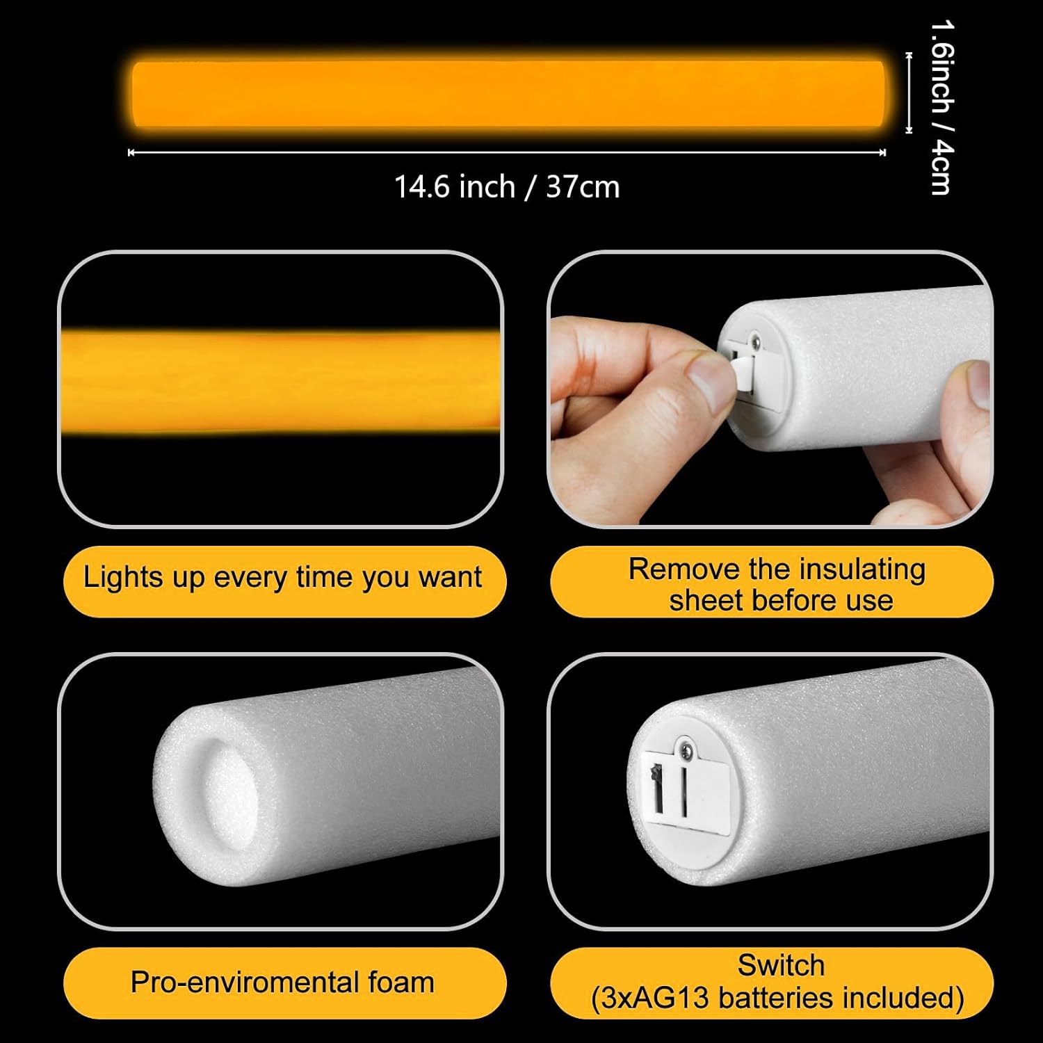 - Glow In the Dark Giant Foam Sticks: You will get 36 pack orange light up foam glow sticks. Press the power button to switch between the 3 different light up modes: quick flashing, slow flashing and alternately flashing. These LED foam sticks boast vibrant colors, offering wider light coverage and ensuring the excitement party experience,bring tons of joy for you. Perfect for theme music festivals, birthday, camping, clubs, shows and more