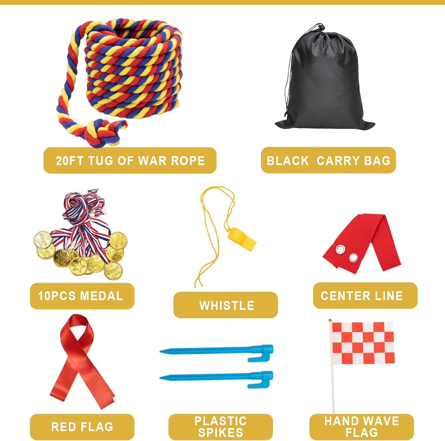 - TUG OF WAR PREPARATION: Field day games set includes 1 * 20 FT-tug of war rope,10* Game prizes, 1 * Flag, 1*Whistles,1 * Center line, 1* Marking line,2 * Plastic pegs, 1 * Storage Bag. If your team pull rope across the center line, You win the games and can used game prizes to reward the winner.Come start an exciting tug of war with your family or friends