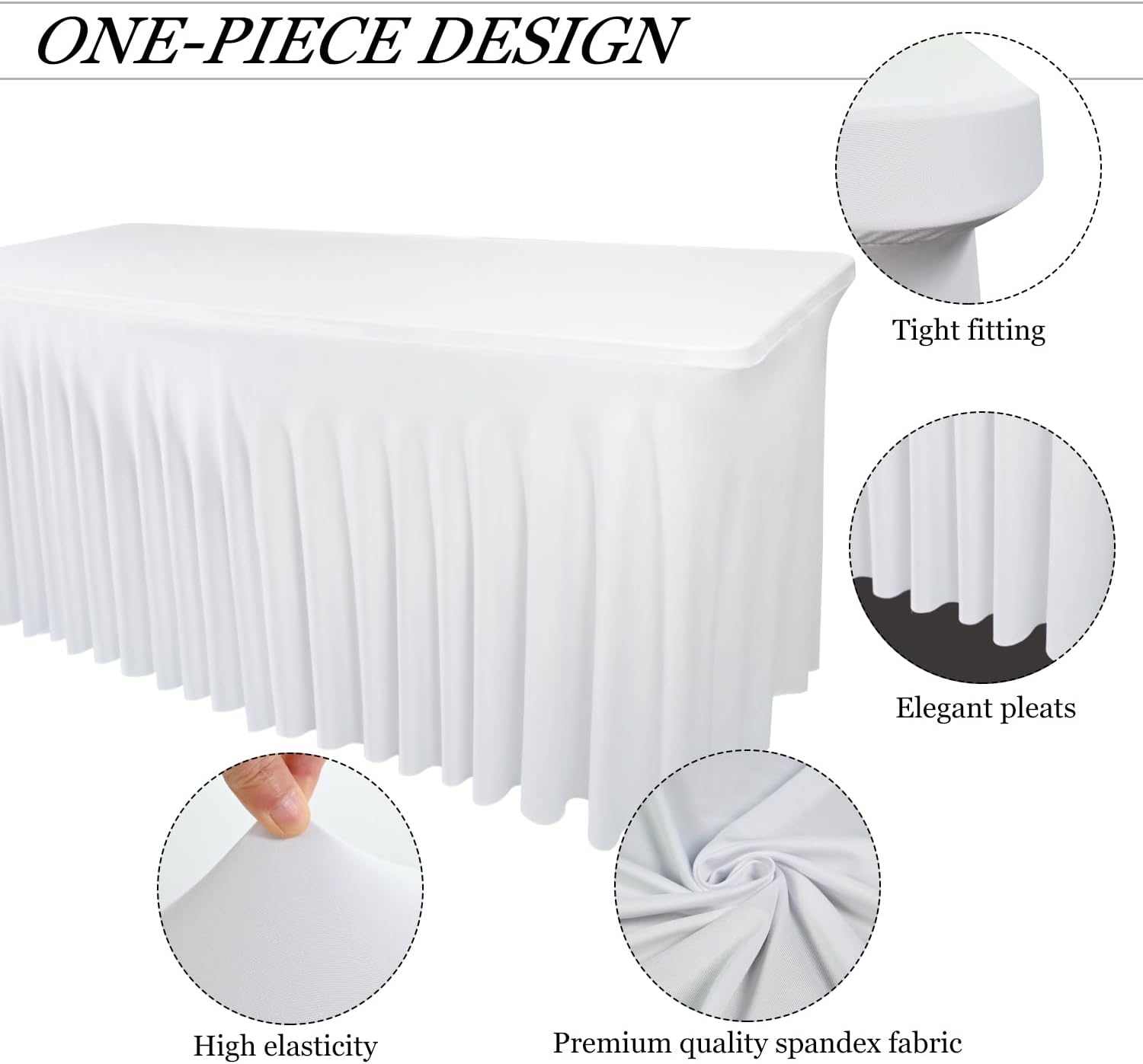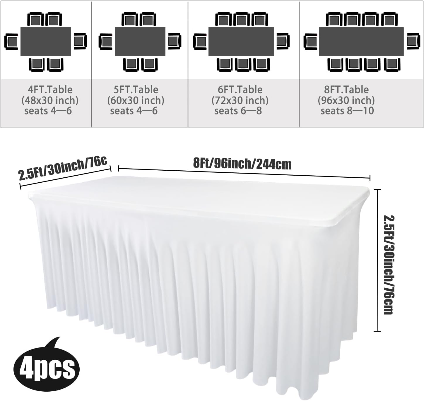 4 Pack - White Spandex Table Skirt for 8ft Tables (96" L x 30" W x 30" H) | Stretch, Washable & Wrinkle-Resistant Fitted Cover | Banquet, Birthday Party Decor