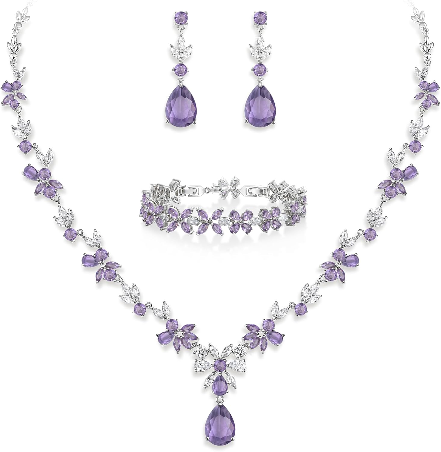 - If you are going out to a party or banquet, this birthstone bridal wedding dangle earrings necklace bracelet set is the perfect accessory that will enhance your outfit. With a fabulous water drop and flower CZ design and solid construction. It features sparkly CZs which will make a timeless accessory to any jewelry collection. This wedding jewelry set can be worn with classy casual or formal attire.