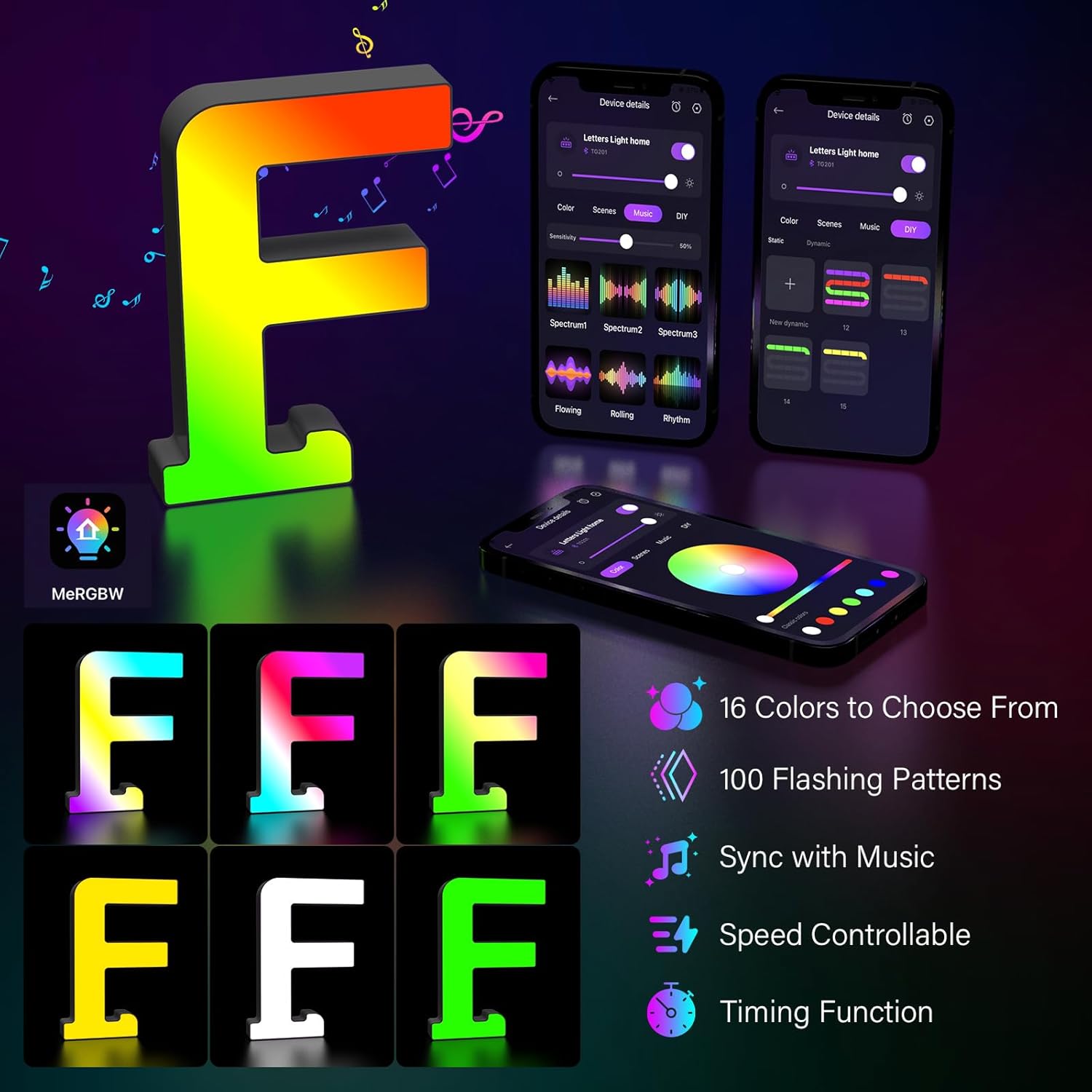 Light Up Letters Marquee Letter - Music Sync RGB Color Changing LED Lights Letter Logo Game Lights for Girls Women Party Birthday Christmas Valentine's Day Wall Desktop Decoration (MRGB-F)