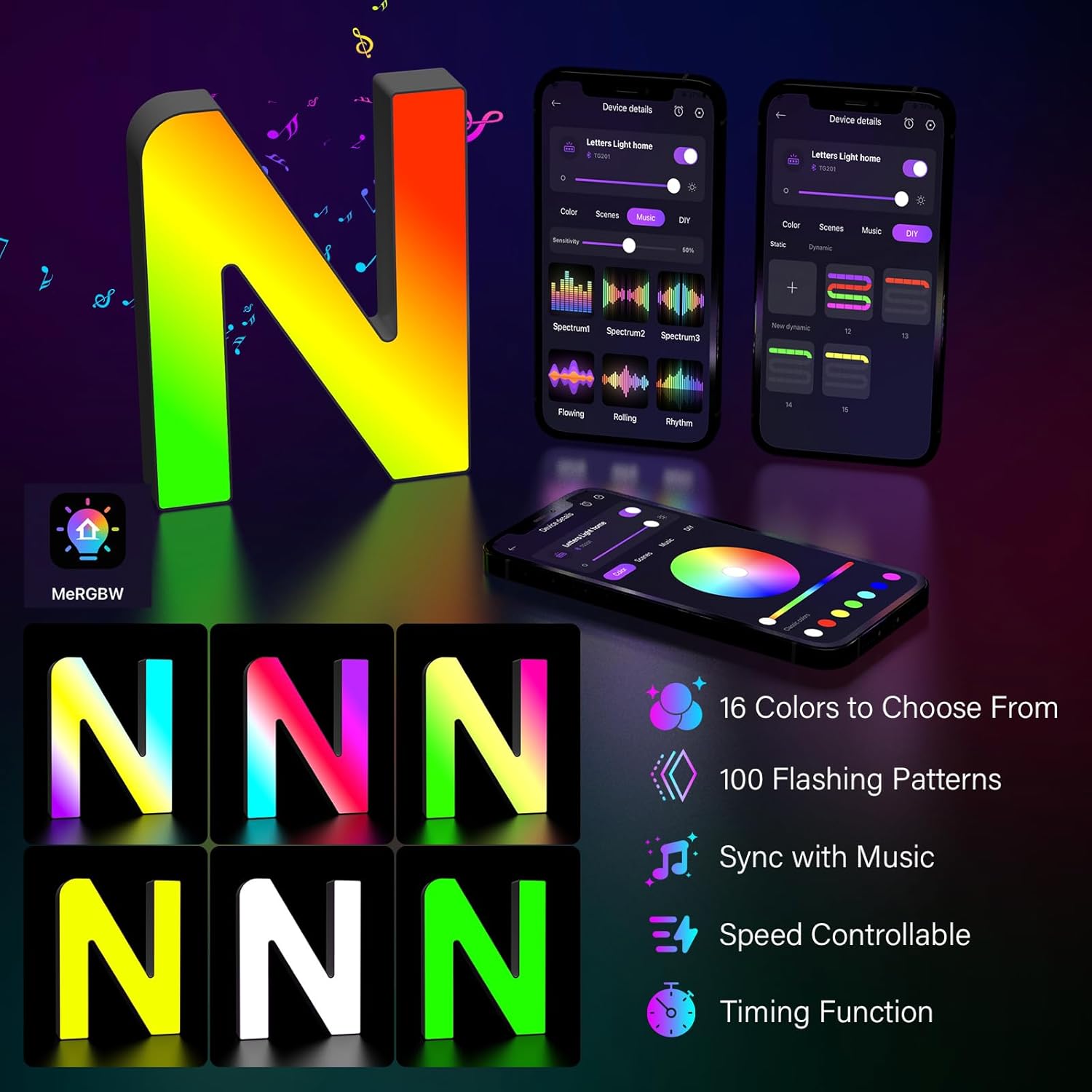 Light Up Letters Marquee Letter - Music Sync RGB Color Changing LED Lights Letter Logo Game Lights for Girls Women Party Birthday Christmas Valentine's Day Wall Desktop Decoration (MRGB-N)