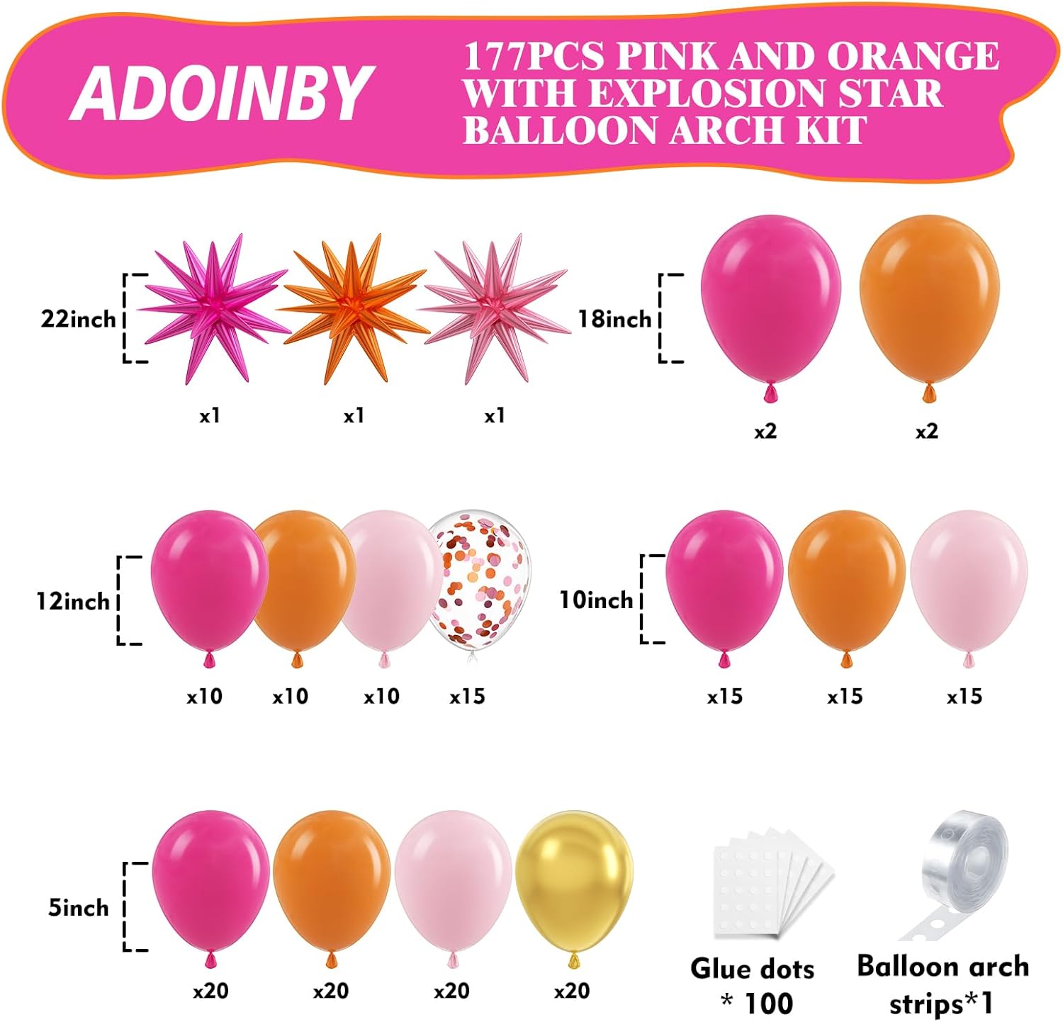 - Pink and Orange Balloon Garland Kit: Include 177pcs balloons 22''(Hot pink explosion star balloons 1, Pink explosion star balloons 1, Orange explosion star balloons 1),18''(Hot pink balloons 2, Orange balloons 2 ),12''(Hot pink balloons 10, Orange balloons 10, Pink balloons 10, Pink Orange confetti Balloons 15), 10''(Hot pink balloons 15, Orange balloons 15, Pink balloons 15),5''(Hot pink balloons 20, Orange balloons 20, Pink balloons 20, Metallic gold balloons 20),16FT garland strip x1,100 dots glue