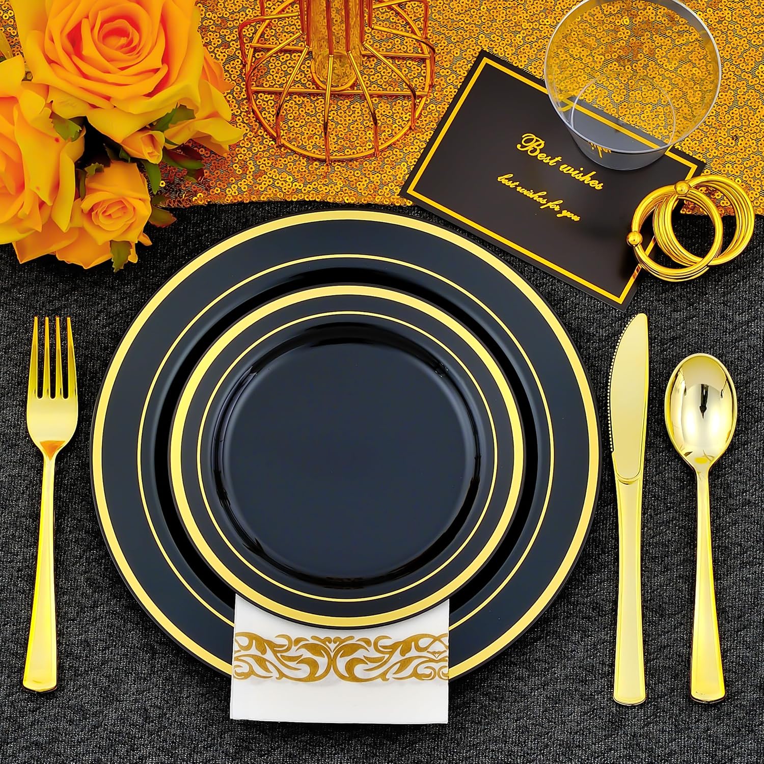 - COMPLETE TABLEWARE SET: One for all needs!This disposable black and gold plastic dinnerware set includes a total of 350 pieces of flatware. You will receive 50 disposable plastic dinner plates, 50 Gold rimmed dessert plates, 50 forks, 50 knives, 50 spoons, 50 cups and 50 napkins, allowing you to effortlessly host parties, weddings, and other events for up to 50 guests while meeting all of your dining needs.