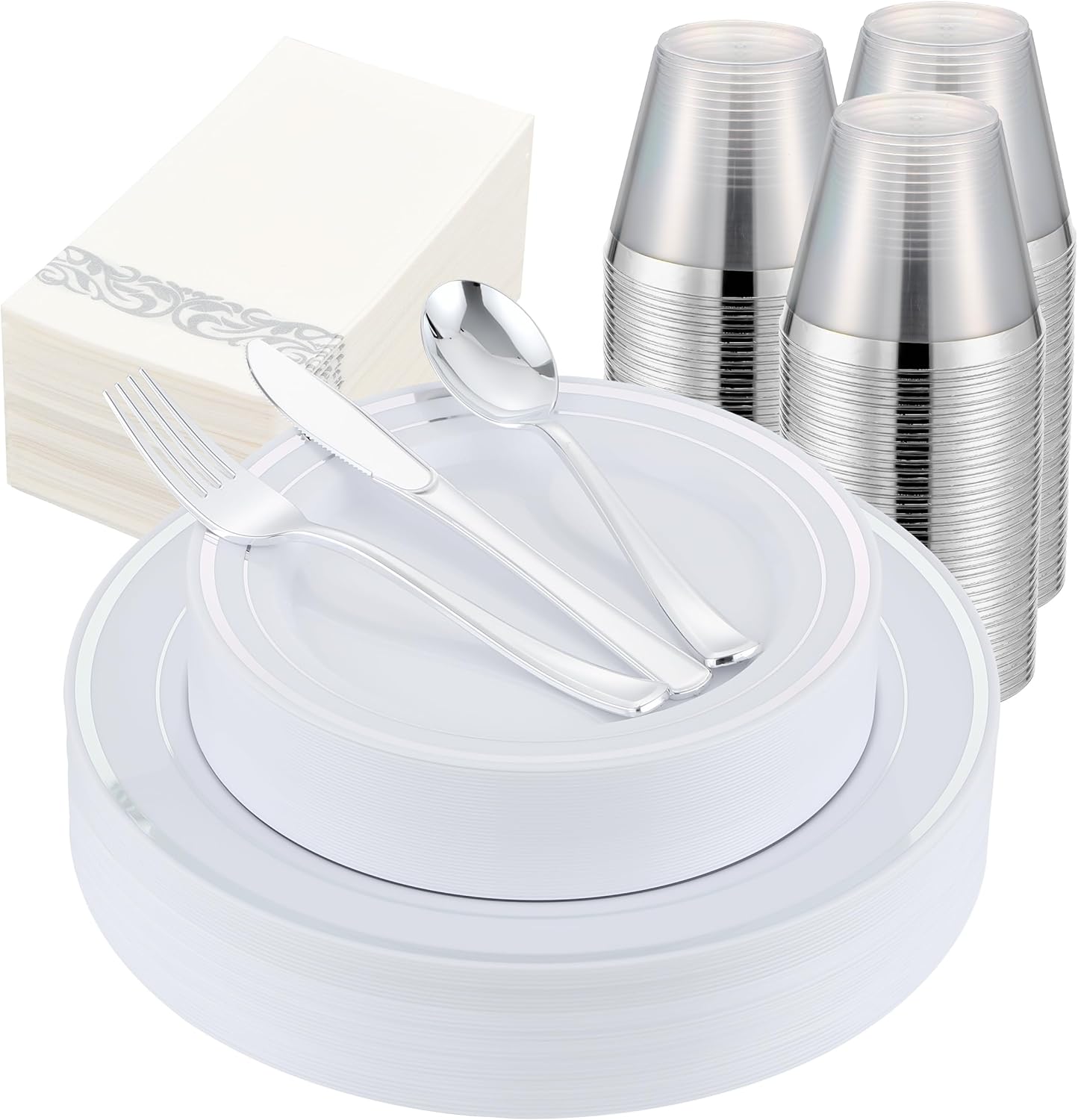 - Complete Tableware Set: This full-service disposable dinnerware set includes everything you need to host up to 50 guests: 50 silver dinner plates, 50 silver dessert plates, 50 forks, 50 knives, 50 spoons, 50 napkins and 50 cups. Whether for a large event or an intimate gathering, this silver cutlery and dinnerware set has you fully covered.