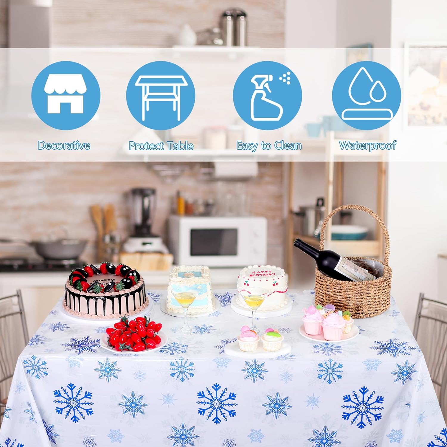 - Snowflake Plastic Tablecloth Size: Snowflake table cover measures 54 × 108 inches, which fits most rectangular 8-10 seater tables. This generous size makes it ideal for gathering around the table with family members to enjoy Christmas time