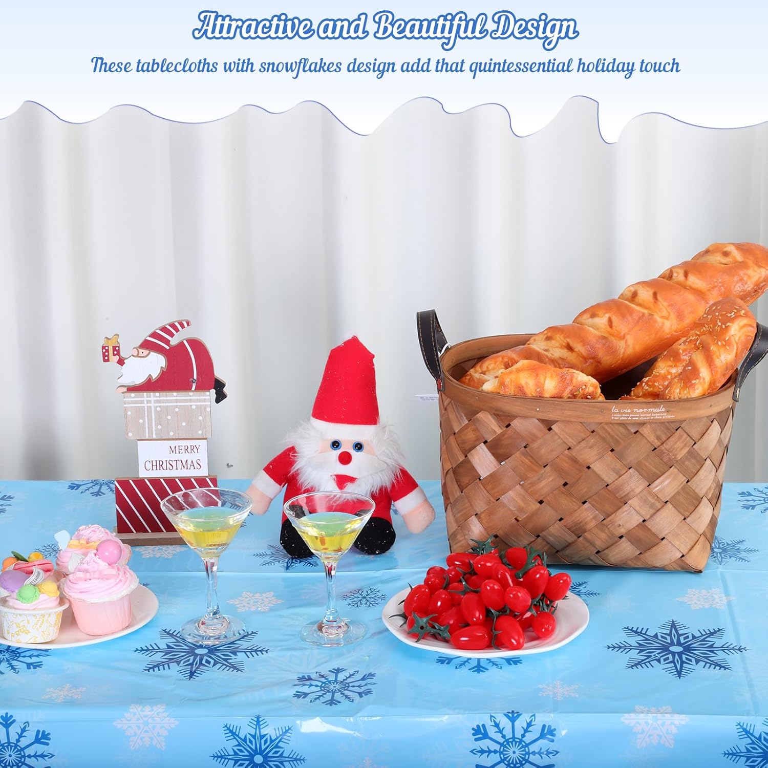 - Snowflake Plastic Tablecloth Size: Snowflake table cover measures 54 × 108 inches, which fits most rectangular 8-10 seater tables. This generous size makes it ideal for gathering around the table with family members to enjoy Christmas time