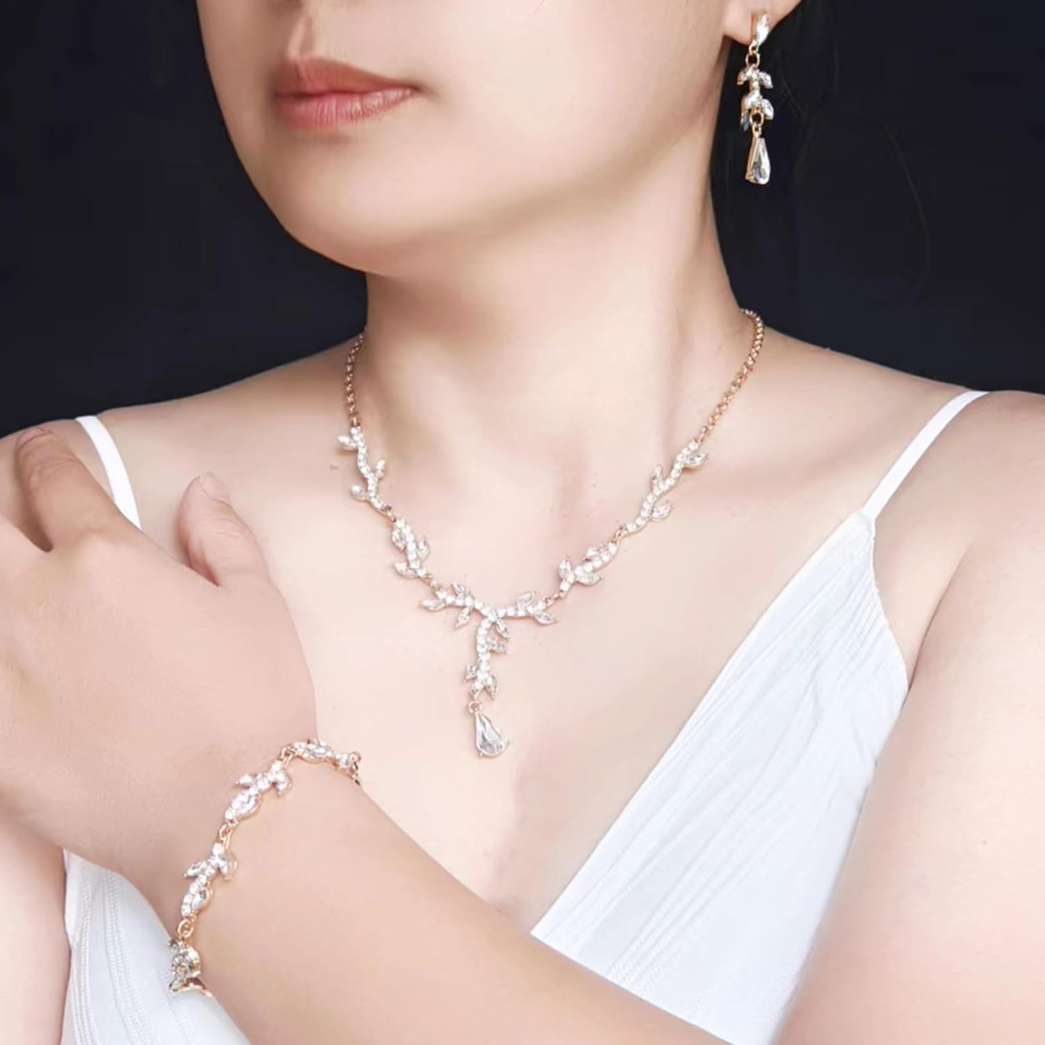 • Elegant Design: This exquisite jewelry set features a stunning rhinestone choker necklace with delicate leaf-inspired accents and dangling teardrop crystals, complemented by matching dangle earrings and a sparkling bracelet.