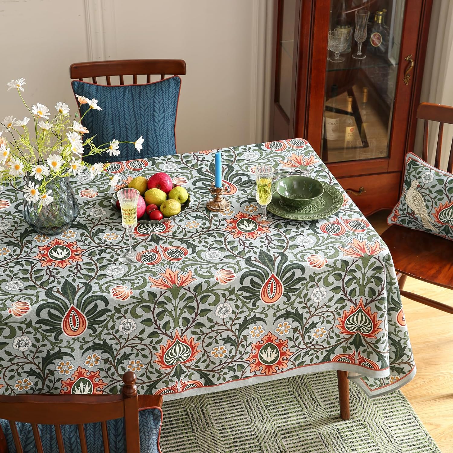 ISAENNE Designer Bohemian Linen Green Rectangular Tablecloth,Floral Indoor Table Cloth,Stain Resistant Decor Tablecloths for Dining Thanksgiving Kitchen Party Christmas,55"*87"-Naples
