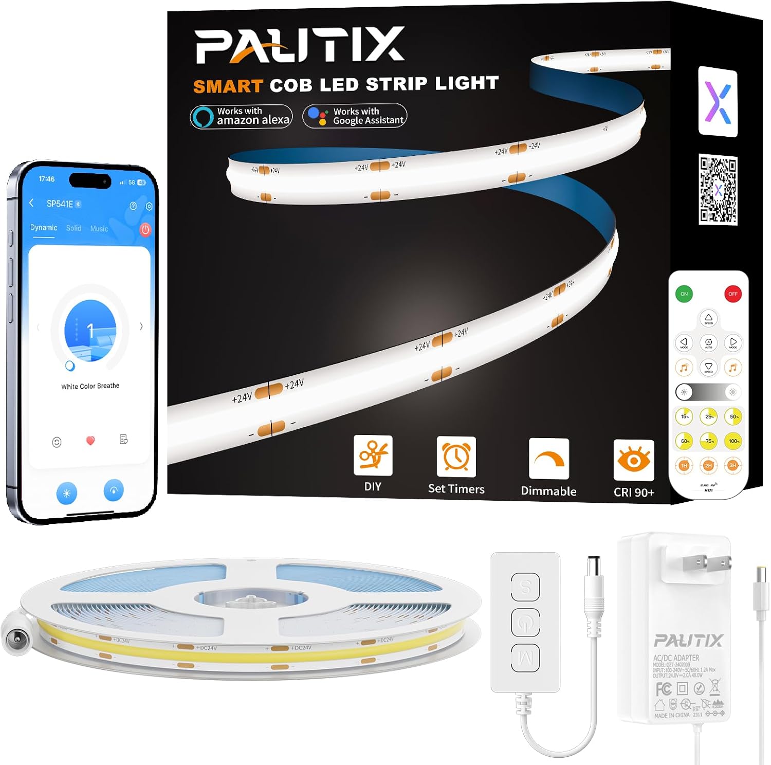 PAUTIX COB LED Strip Light 32.8ft/10m,Work with Alexa/Google Assistant,4800LEDs Dailylight White 6000K,CRI93+ Super Bright High Lumen,Dimmable 24V Flexible LED Tape Light,for Home&Office DIY Lighting