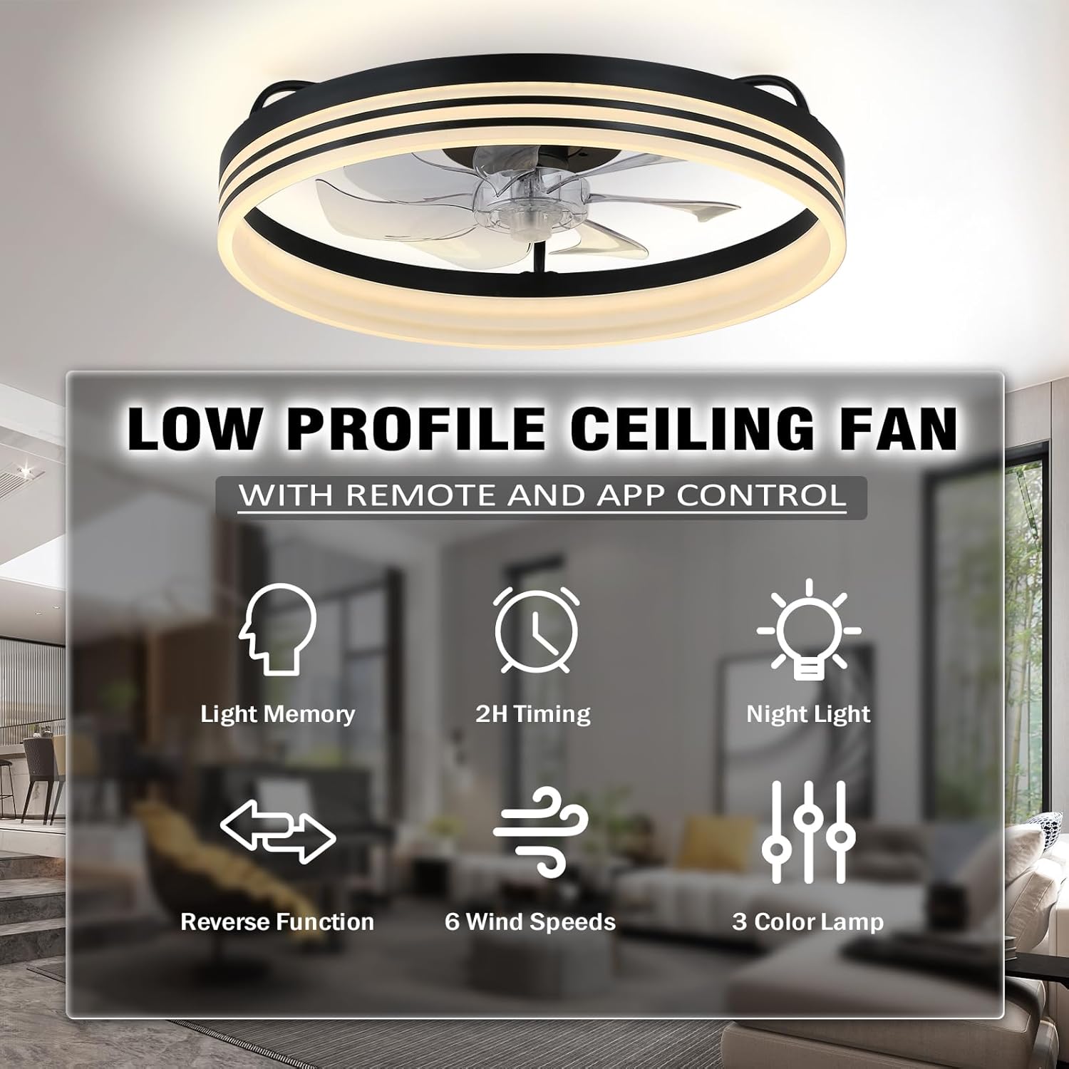 Ceiling Fans with Lights and Remote 20'' Flush Mount Ceiling Fan Dimmable Fandelier LED Fan Light Low Profile Ceiling Fan with 6 Speeds for Bedroom Kitchen and Living Room(Black)
