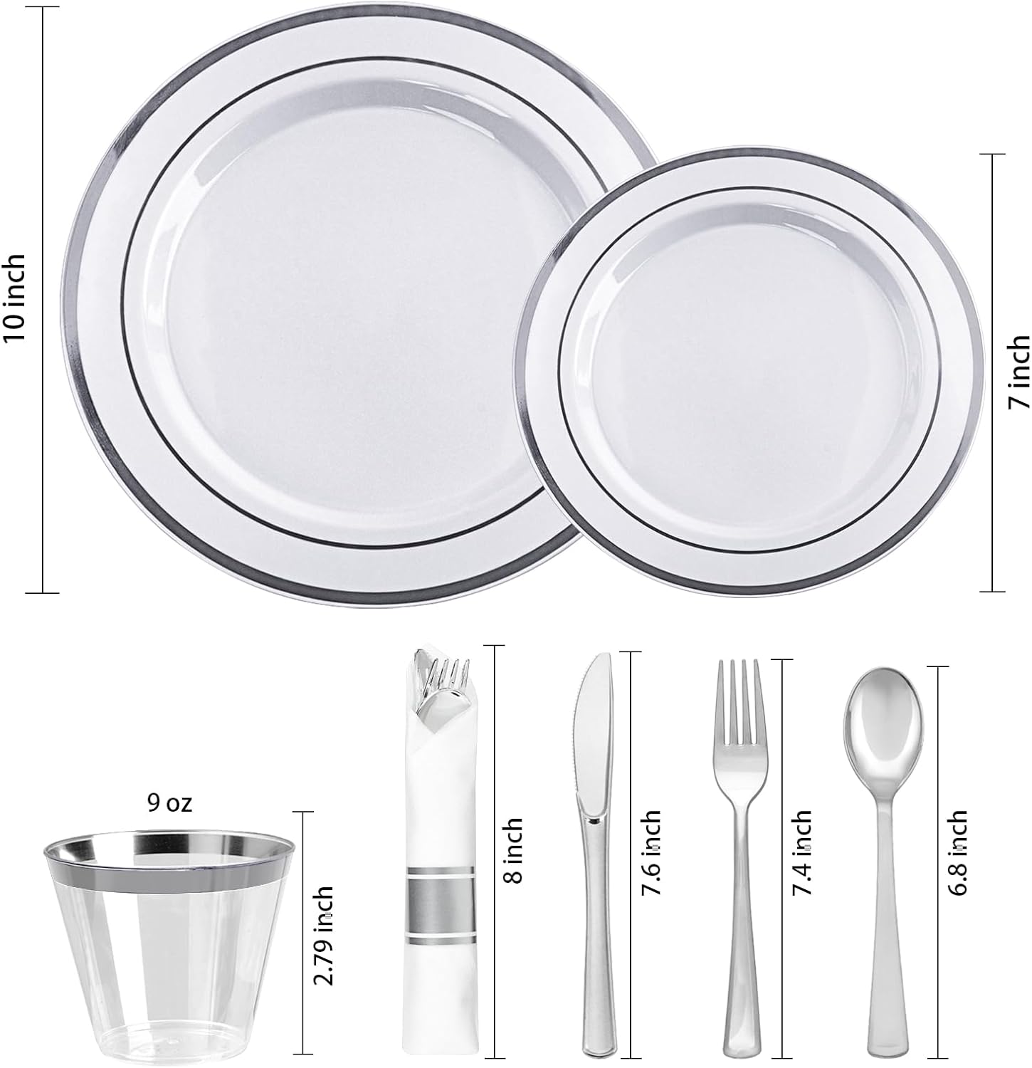 - All Occasions: The dinner plates and dessert plates are perfect for a range of events including weddings, birthdays, anniversaries and casual gatherings; the plastic silver silverware set is an ideal for various occasions
