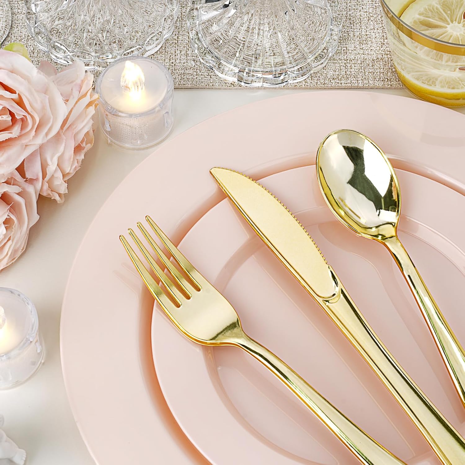 - All Occasions: The dinner plates and dessert plates are perfect for a range of events including valentines, weddings, birthdays, anniversaries and casual gatherings; the plastic gold silverware set is an ideal for various occasions