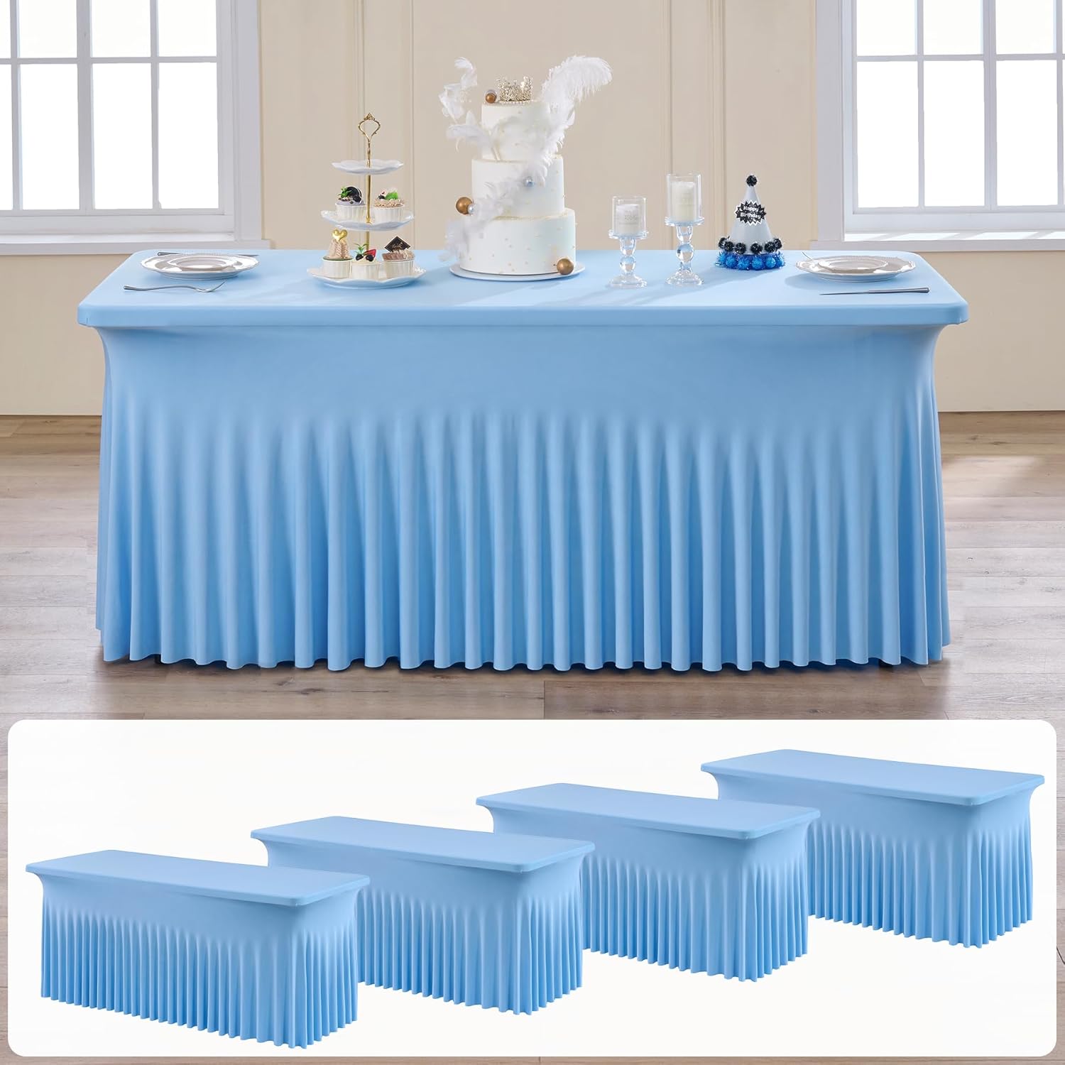 4 pk Baby Blue Spandex Tablecloth 6ft with Ruffle Skirt, Wrinkle Free High Stretch Fitted Tablecloths for 6 Foot Rectangle Tables, Blue Eastic Spandex Table Covers 6ft for Parties Banquet Weddings