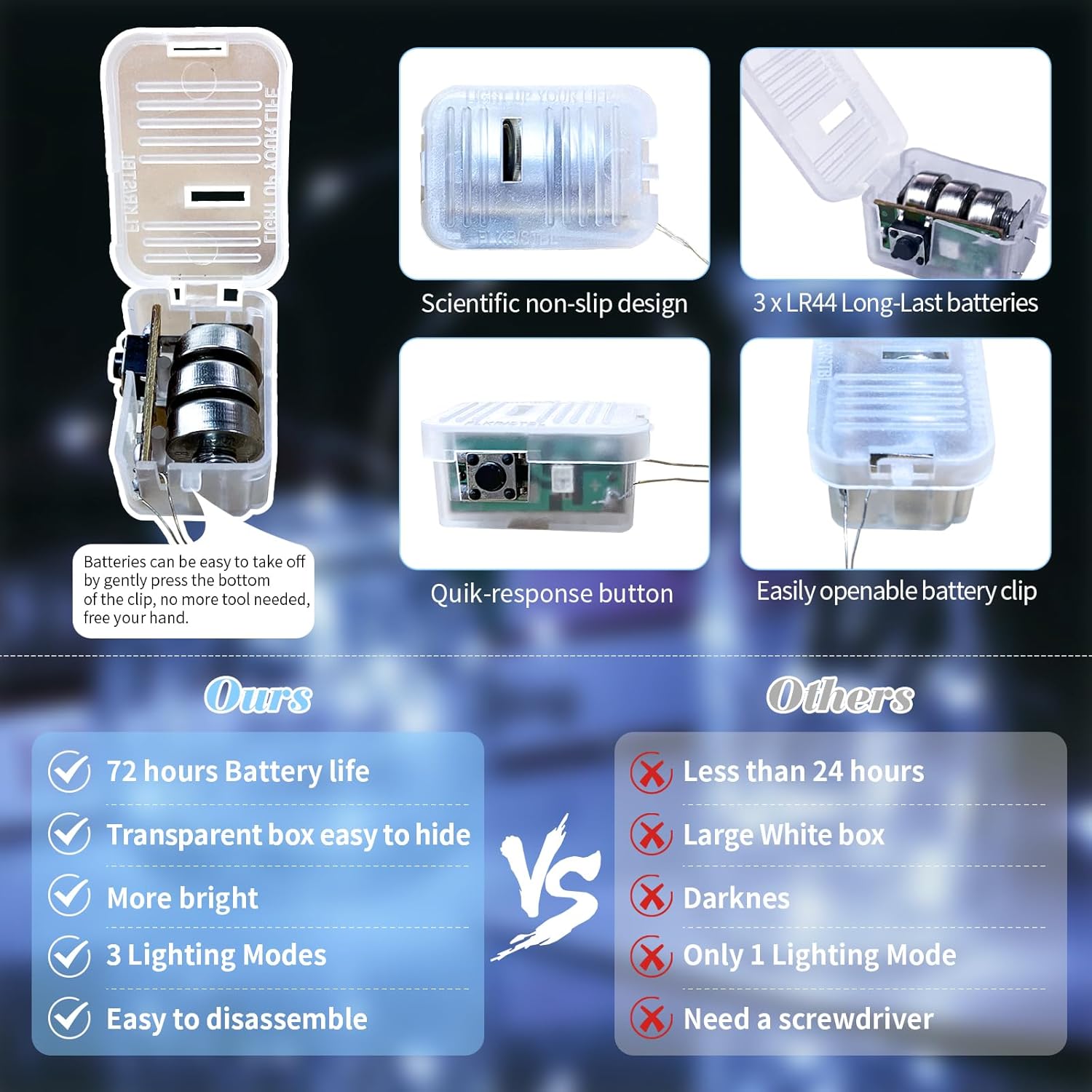 - UPGRADED DESIGH AND EASY TO REPLACE: The fairy lights' newest clear and small battery box is 0.78*1.25 inches in size, very easy to hide into all your DIY projects. The upgraded battery pack has scientific non-slip design on both sides, which makes it feel comfortable and easy to catch. Batteries are also very easy to take off, no more screwdriver needed, just gently press the bottom of the clip to open, free your hand