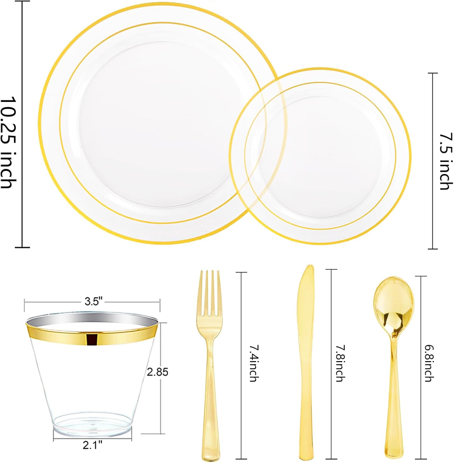 - LUXURIOUS STYLE: These clear plastic plates are adorned with golden patterns, where delicate textures complement the gold, creating a high-end and visually striking dining experience. We believe these clear gold plastic dinnerware set will provide you with the perfect usage experience