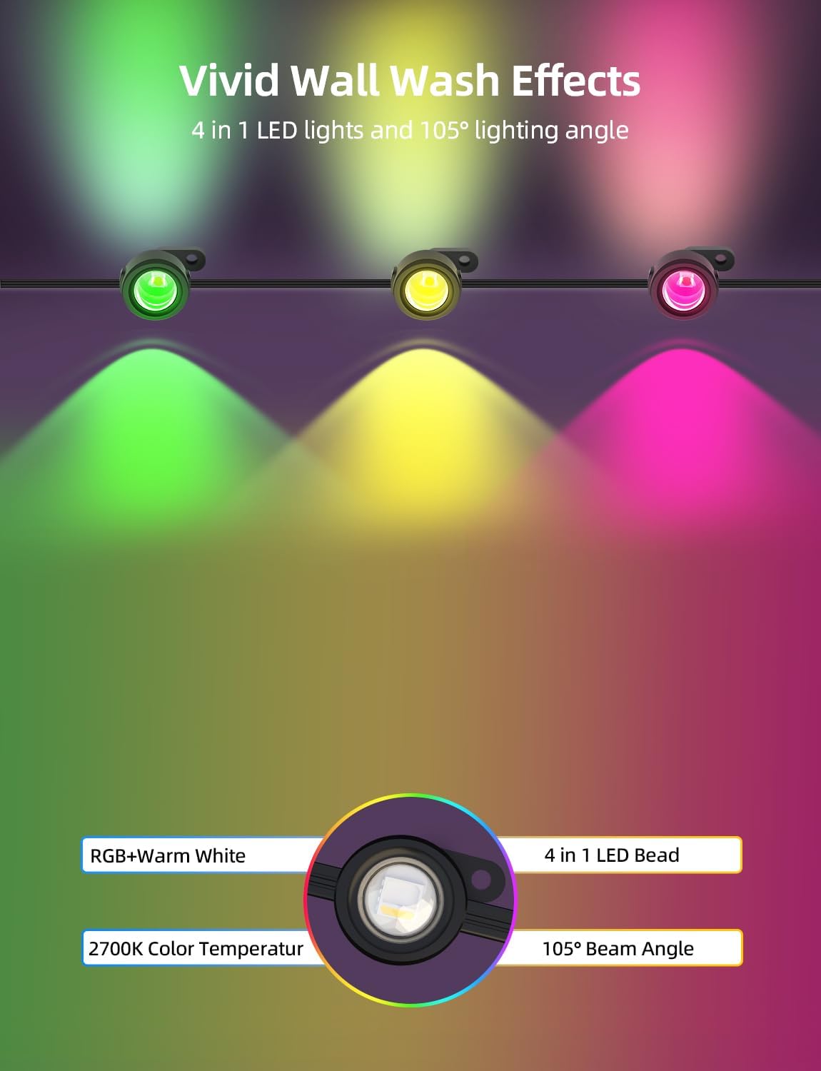 - Vivid Lighting Effects: 4-in-1 RGB+WW lens design with beam angle up to 105° and the wall washing depth up to 16 inches. It is recommended to install the lights 2-4 inches away from the wall surface. With 2700K color temperature, the warm white light brightness up to 40lm each, good for daily lighting. RGB brightness up to 25lm each, creating personal ambiance. The ideal permanent lights support color changing and brightness adjustable