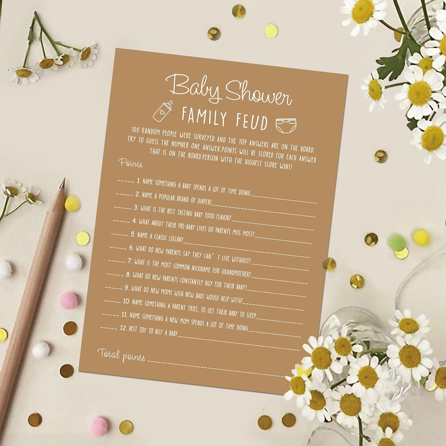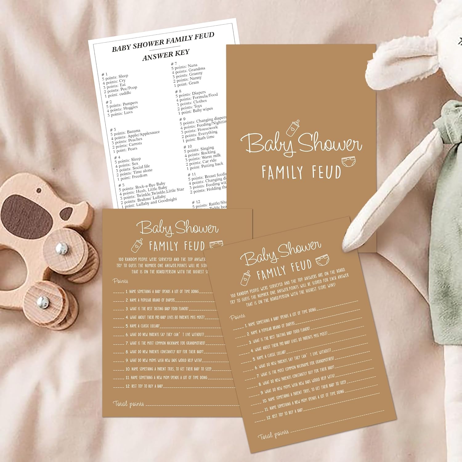 Family Feud Baby Shower Game - Pack of 30 Cards, Answer Key, Gender Neutral Decorations, Feud Game Supplies-01F-Caramel