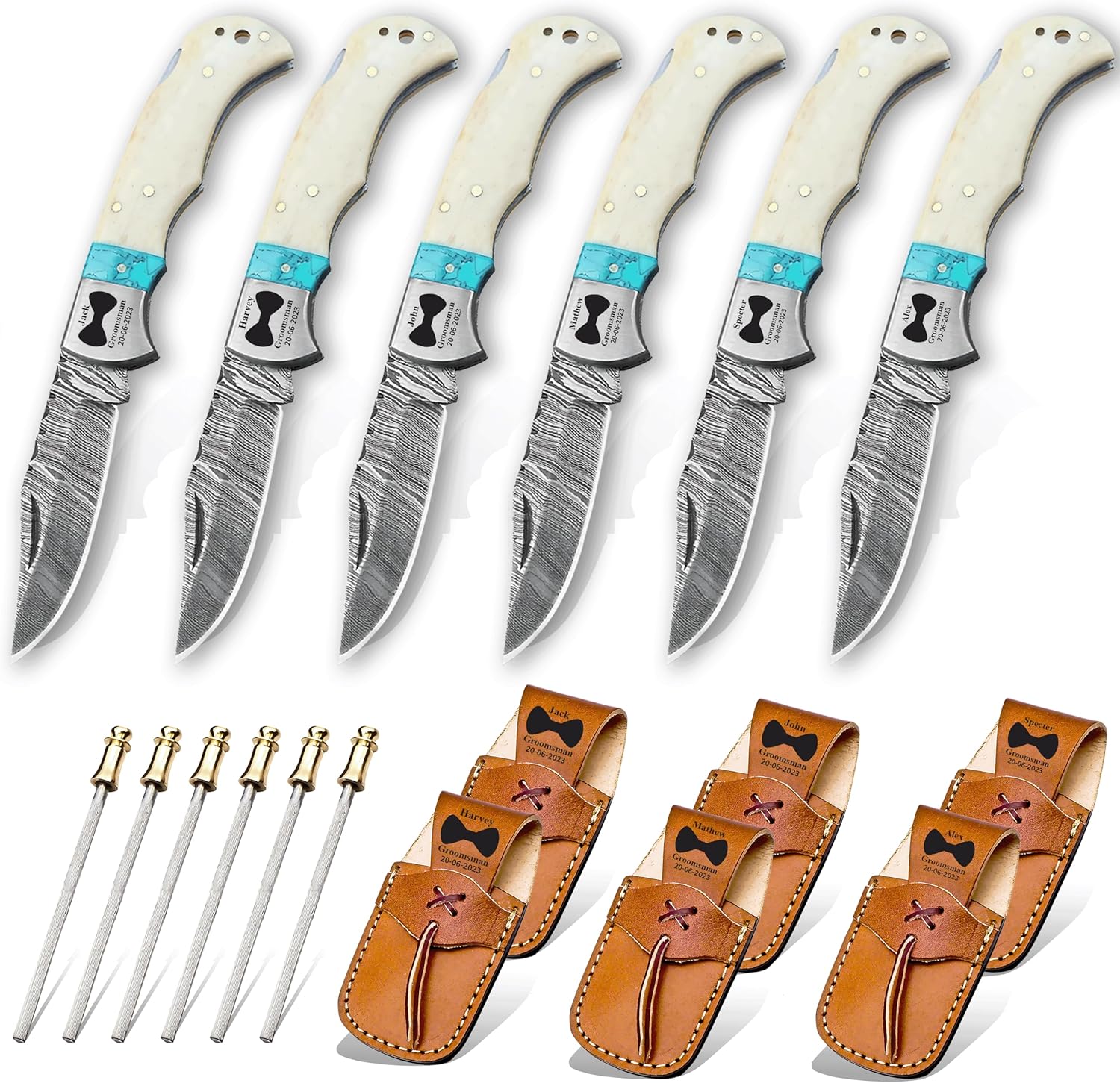 Set of 6 - Personalized Damascus Pocket Knife for Groomsmen -With Leather Sheaths - Custom Engraved Pocket Knives | Groomsman Gifts for Wedding, Groomsmen Proposal Gifts