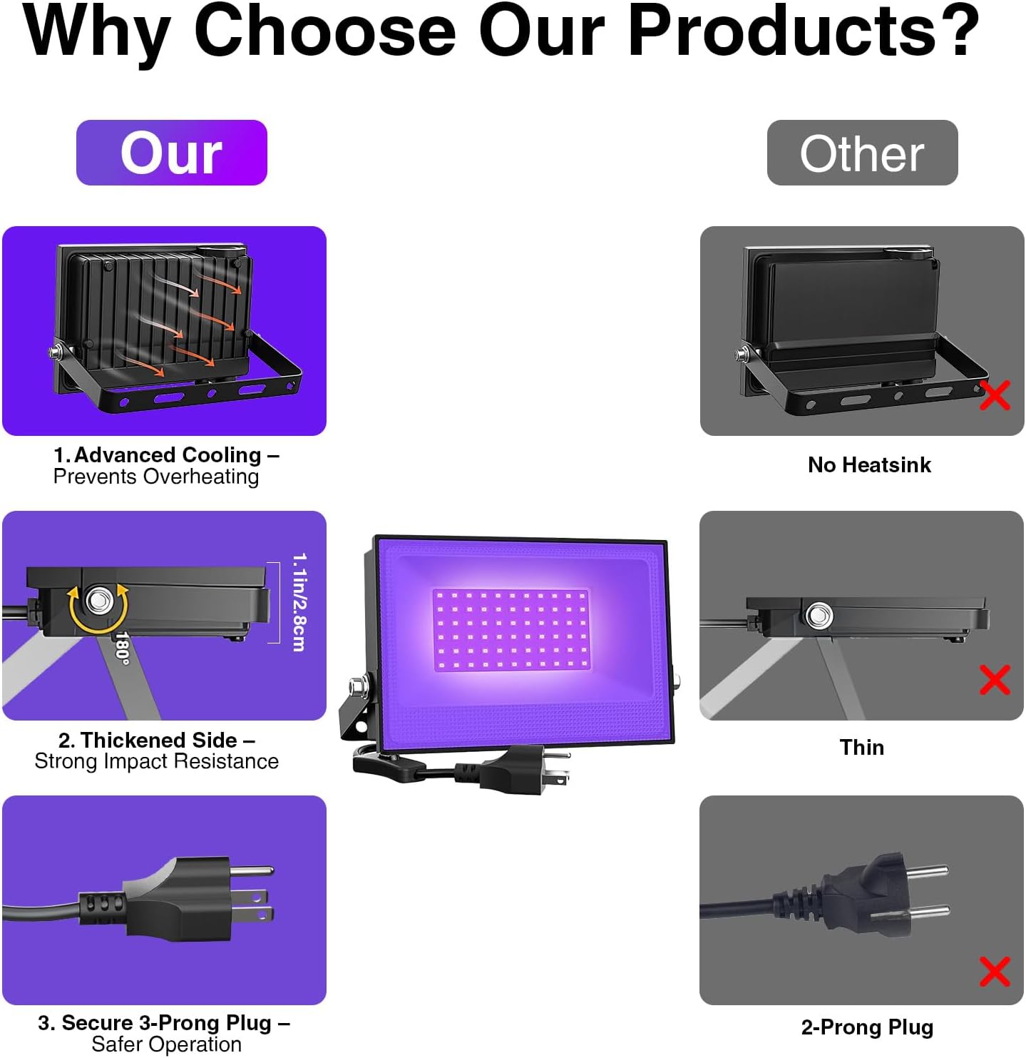 - EFFICENT COOLING : This 38W black light flood light fixture is designed with a fin-type heat sink, which means it acts like a radiator to dissipate heat;