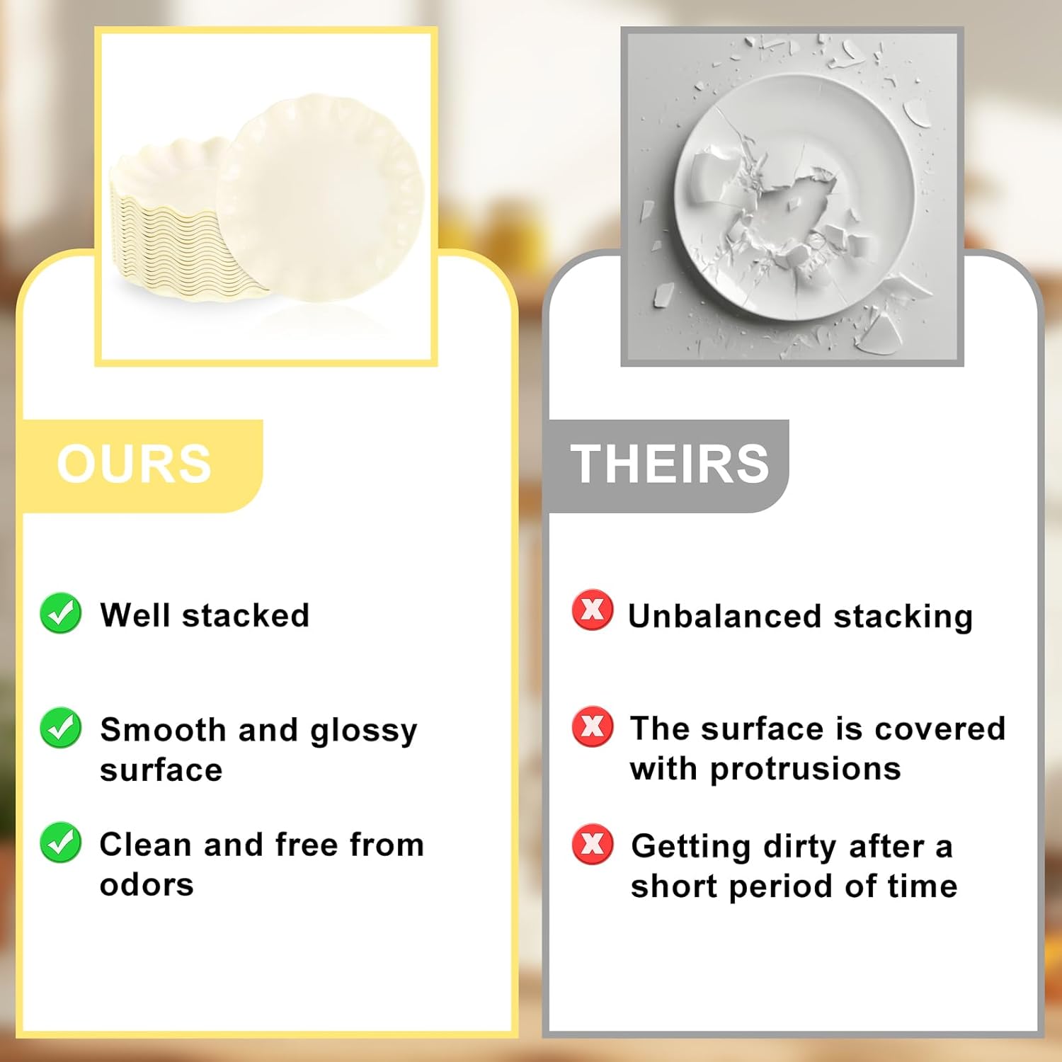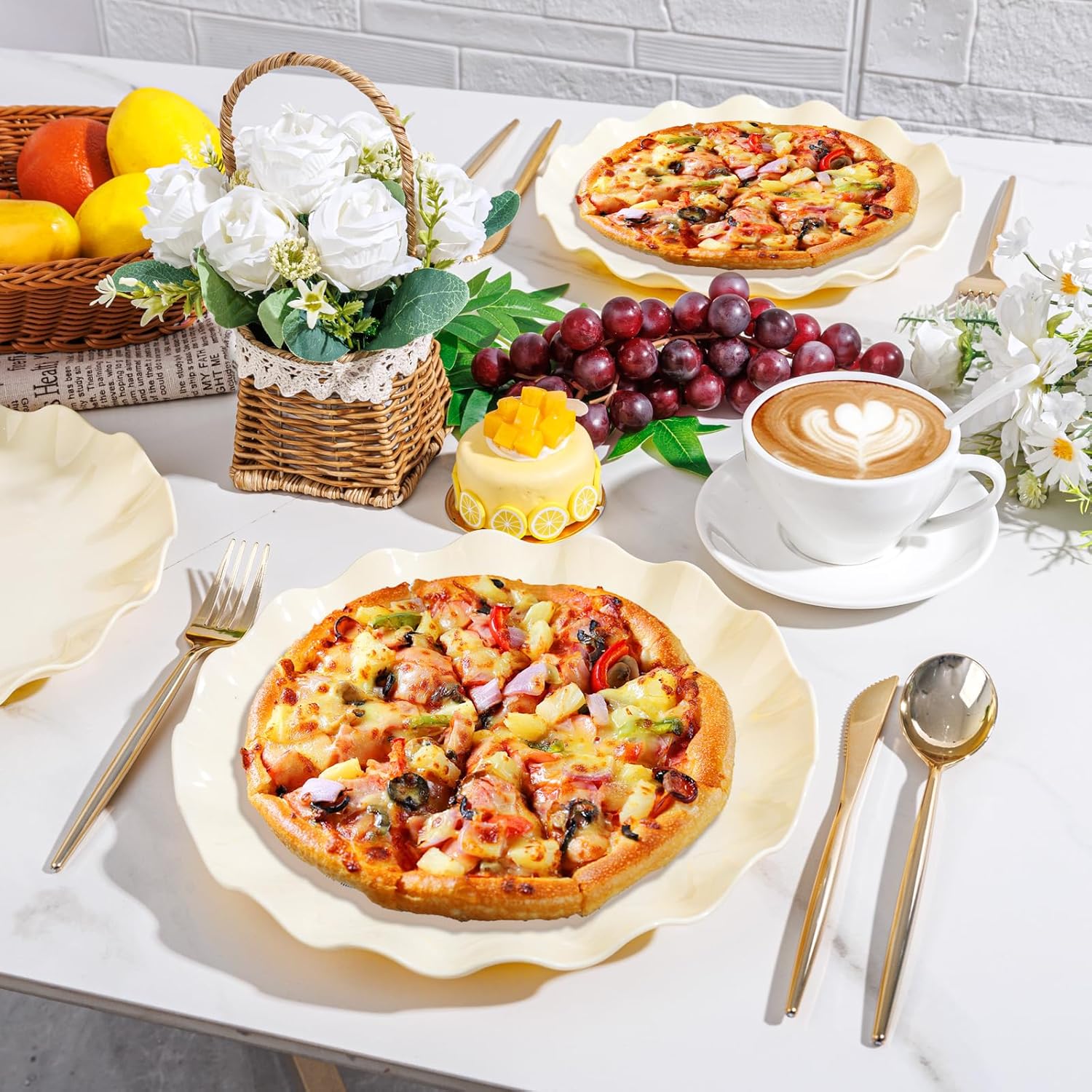 - 【Light luxury Beige plastic plates】The classic plastic plates reusable,paired with exquisite scalloped edges,instantly elevates the dining table style for weddings,bridal showers,or holiday parties creating a high-end banquet visual experience.The unique beige and yellow color scheme perfectly blends with themed decorations such as weddings,creating a relaxed and luxurious atmosphere for buffet and dinner tables!