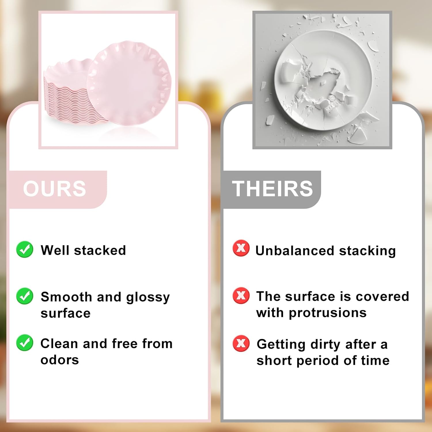 - 【Elegant Pink plates】The simple and elegant pink,combined with the classic scalloped contour,creates a visual texture of high-end plastic plates,easily upgrading the dining table's sense of ceremony.Whether it's wedding banquet table decorations,plastic plates for weddings/parties,or outdoor picnics,they can seamlessly blend into the scene,bidding farewell to the roughness of cheap tableware!