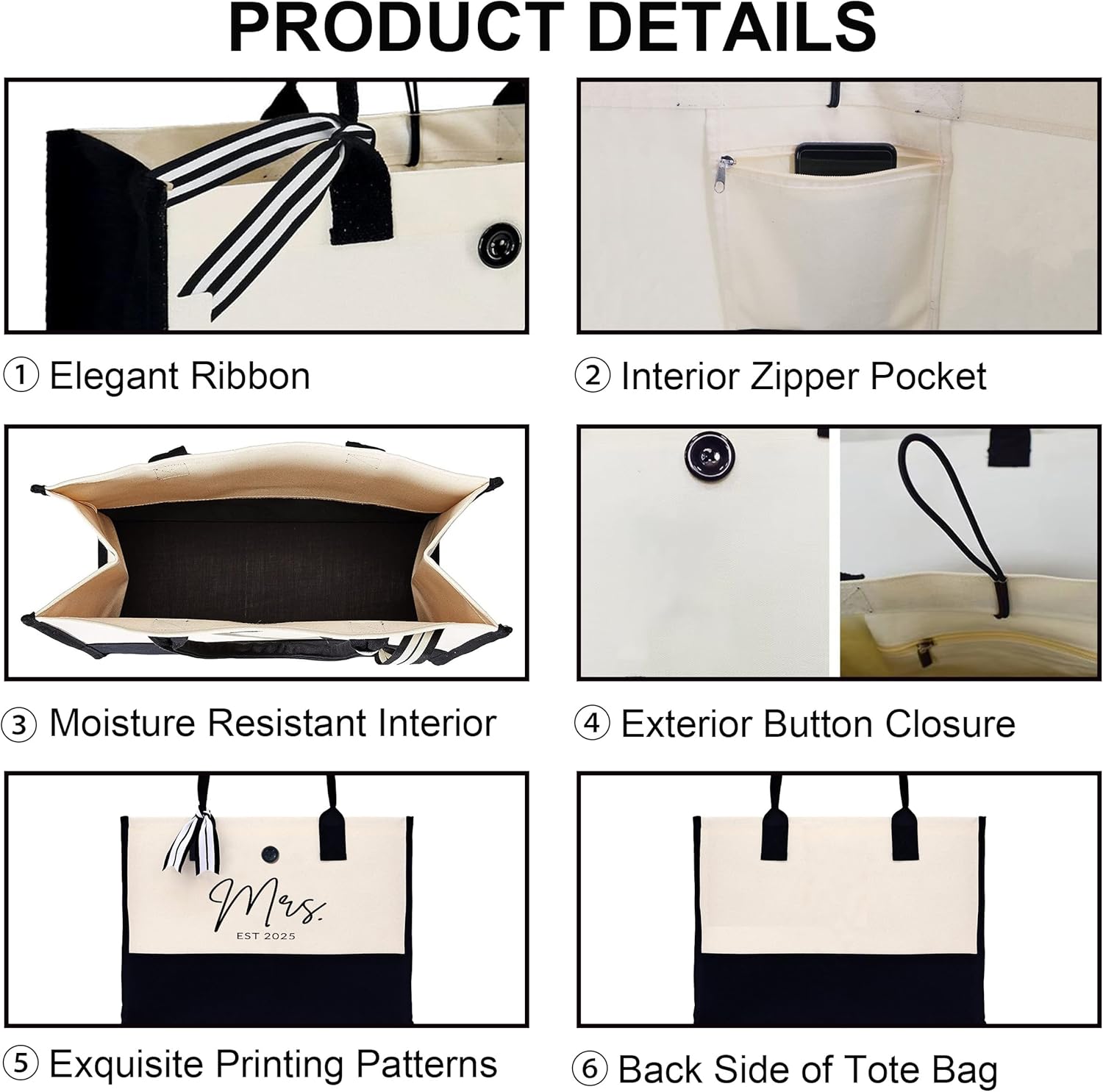 - 【Classic Design】 The tote bag features the exquisite words "Mrs. EST. 2025" printed on it in an elegant and eye-catching font that adds a touch of glamour to your everyday look. Classic black and white stitching, very fashionable.