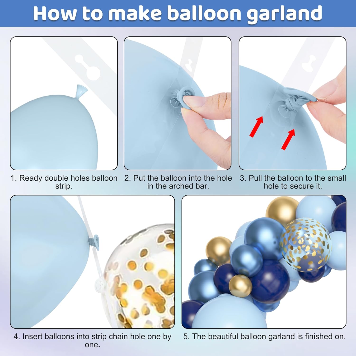 - Easy to Use: Our blue balloon arch kit comes with balloon accessories which can help you create the perfect blue and gold balloon arch kit; You can make daisies balloons with flower clips; Hooks can help better secure balloons where you need; Design your blue and gold balloon arch kit by inflating the balloons with helium or air, then attach them with balloon strip or ribbon; And you also can use glue points to add small balloons to the garland