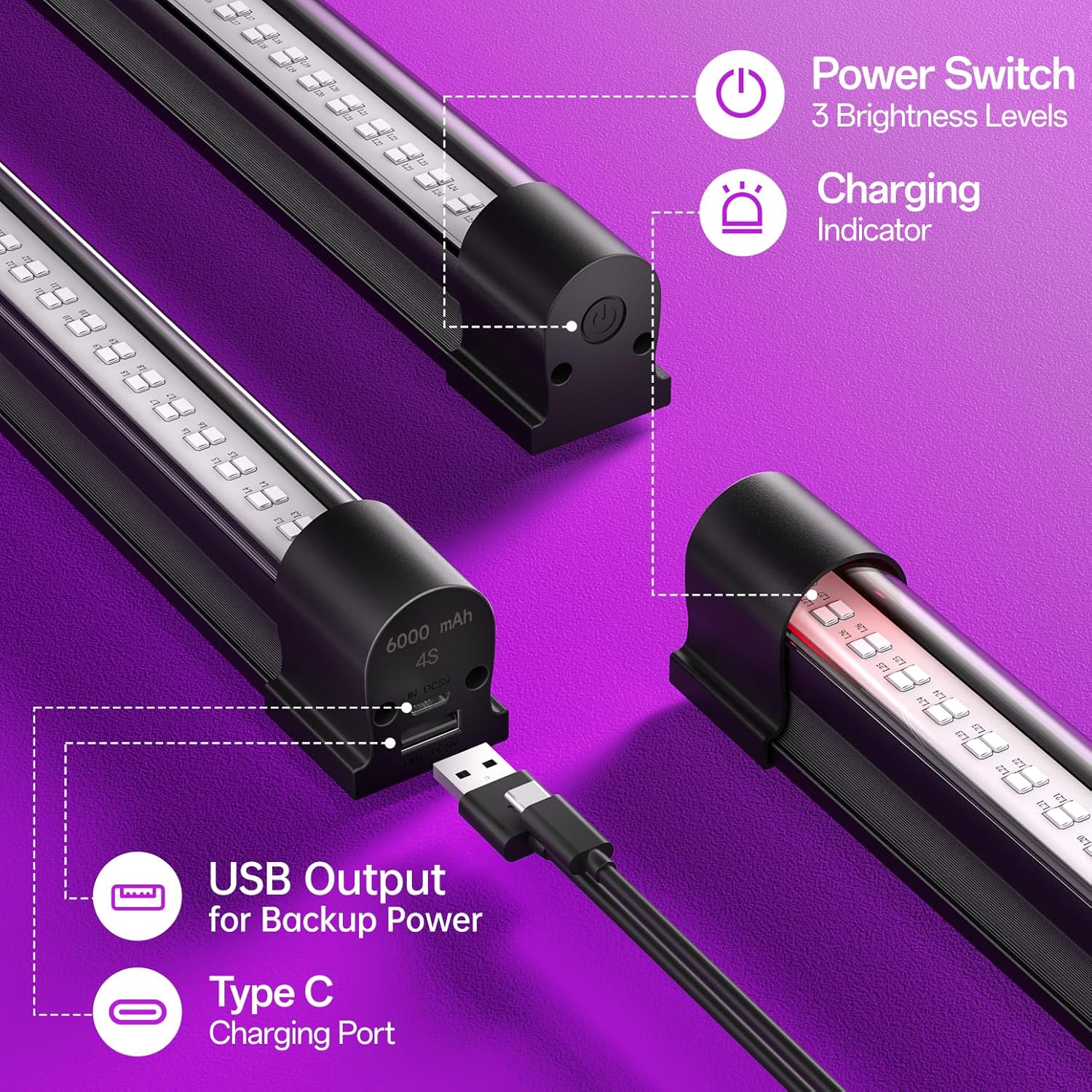 - Long-lasting Rechargeable Black Light - The blacklight features a 6000mAh battery, allowing for a comfortable continuous use of 4 to 40 hours on a single charge with the convenient USB charging cable