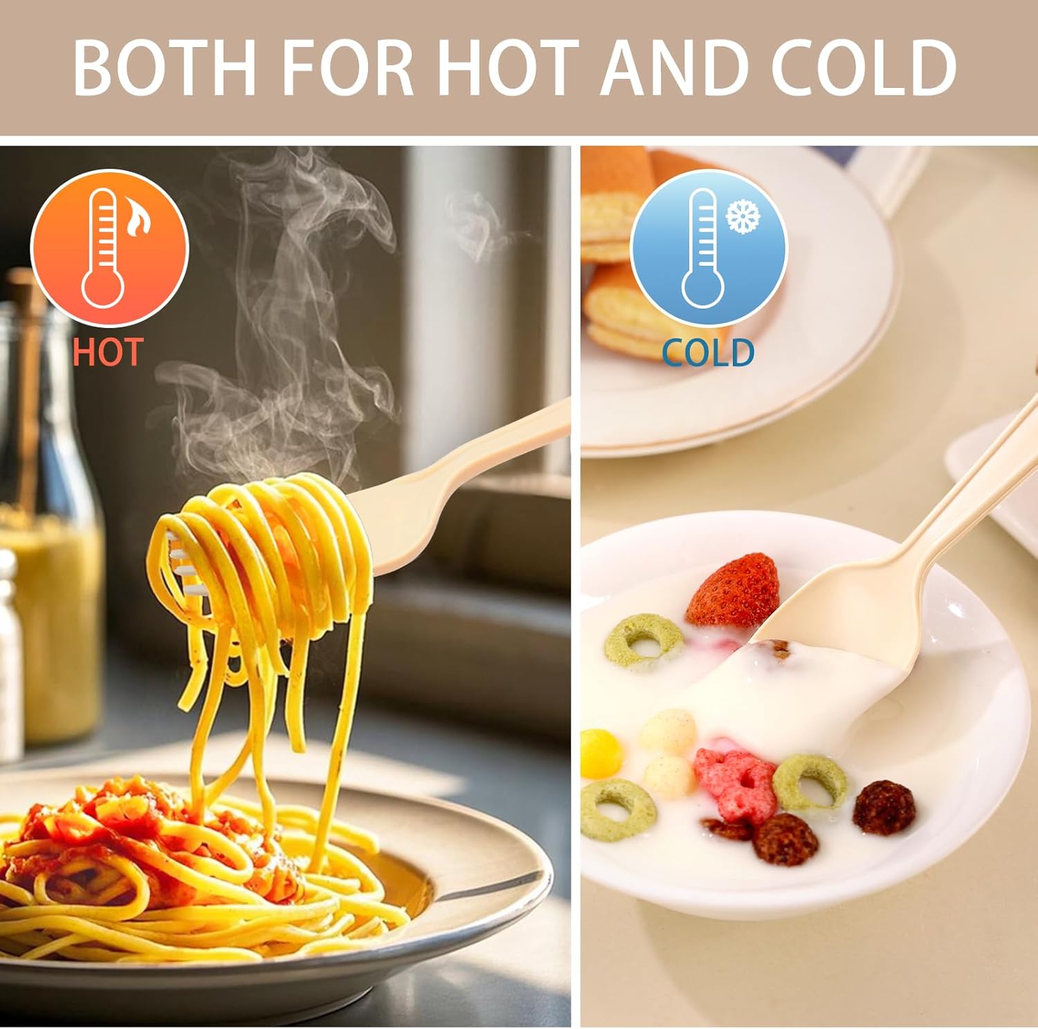 - 【Thickened Design & High-Temperature Resistance】The heavy duty disposable spoons and forks feature a thickened structure and reinforced blade tips, providing exceptional strength to withstand hard foods (meat, pasta, peanut butter) without bending or breaking. The compostable utensils have high-temperature resistance (-4°F to 212°F), making them suitable for hot soup and hot meals.