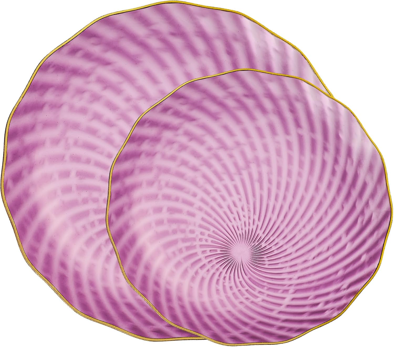 PLASTICPRO 30 Pack Plastic Set of 15-10 inch Plates and 15-7 inch Dishes Elegant Clear Purple Spiral and Gold Rim Disposable Fancy Plates Premium Heavyweight