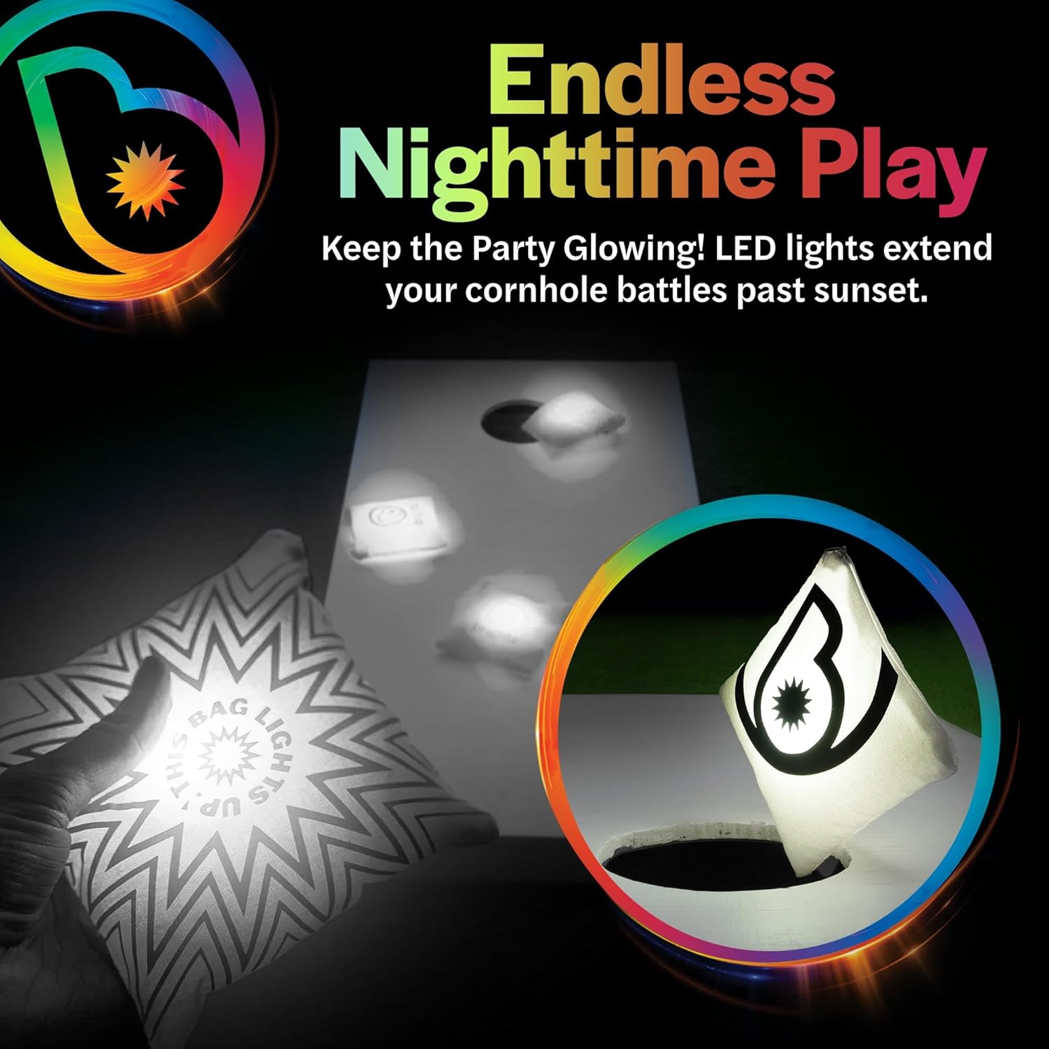 - LIGHT UP CORNHOLE BAGS - keep the game going after dark! Equipped with waterproof LED light modules, our cornhole bags add a splash of color to your evening games, making every toss shine. Sold in packs of 4 - buy another color for a full set of 8!