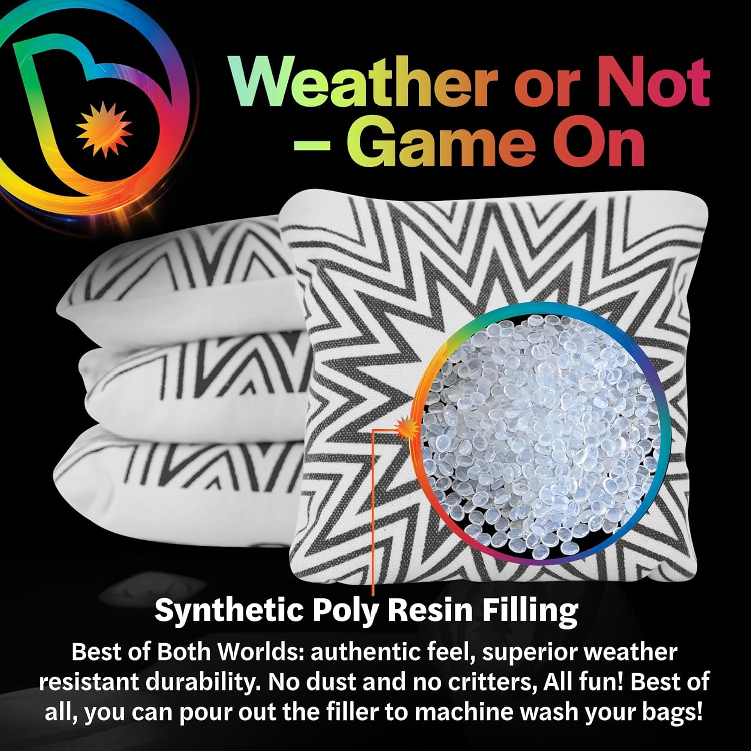 - ALL-WEATHER PLAYABILITY - made to last, these glowing cornhole bags are filled with finely chopped poly resin pellets, offering weatherproof qualities and an authentic gaming experience. They're ideal for outdoor play no matter the weather conditions