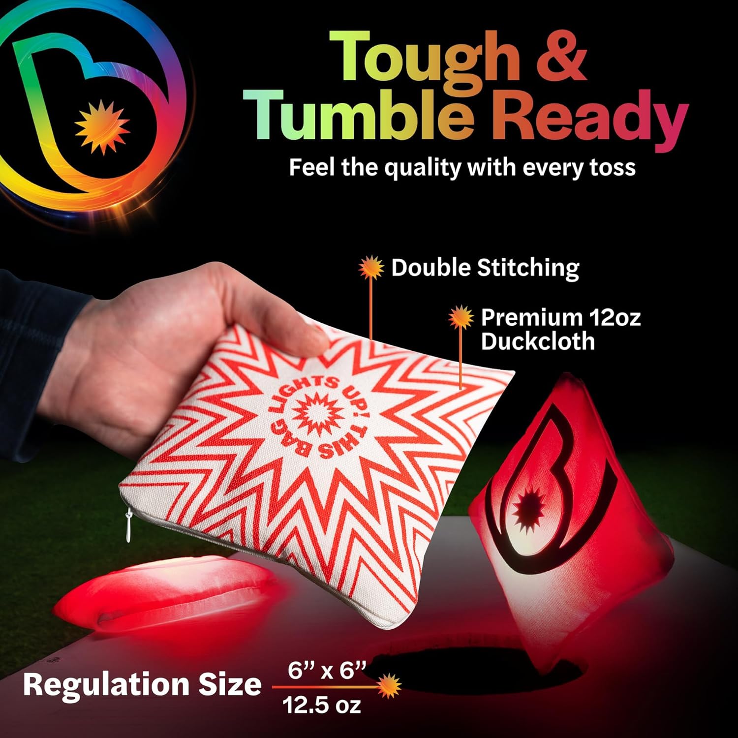 - REGULATION FEEL, ENHANCED DURABILITY - experience the traditional feel of cornhole with a twist. Our LED Cornhole Bags are crafted from premium 12 oz. duckcloth, double-stitched for extra resilience, ensuring they withstand the rigor of any game