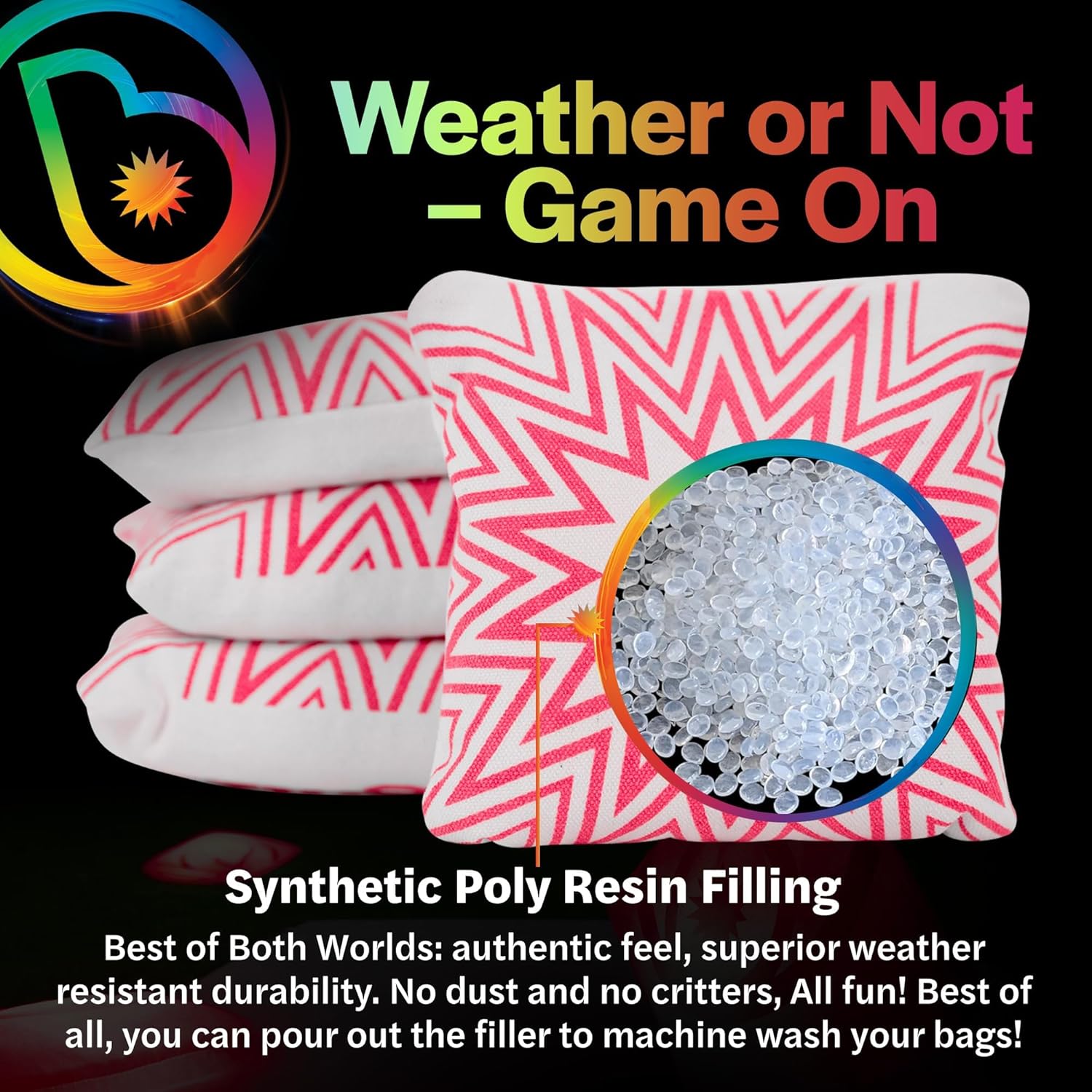 - ALL-WEATHER PLAYABILITY - made to last, these glowing cornhole bags are filled with finely chopped poly resin pellets, offering weatherproof qualities and an authentic gaming experience. They're ideal for outdoor play no matter the weather conditions