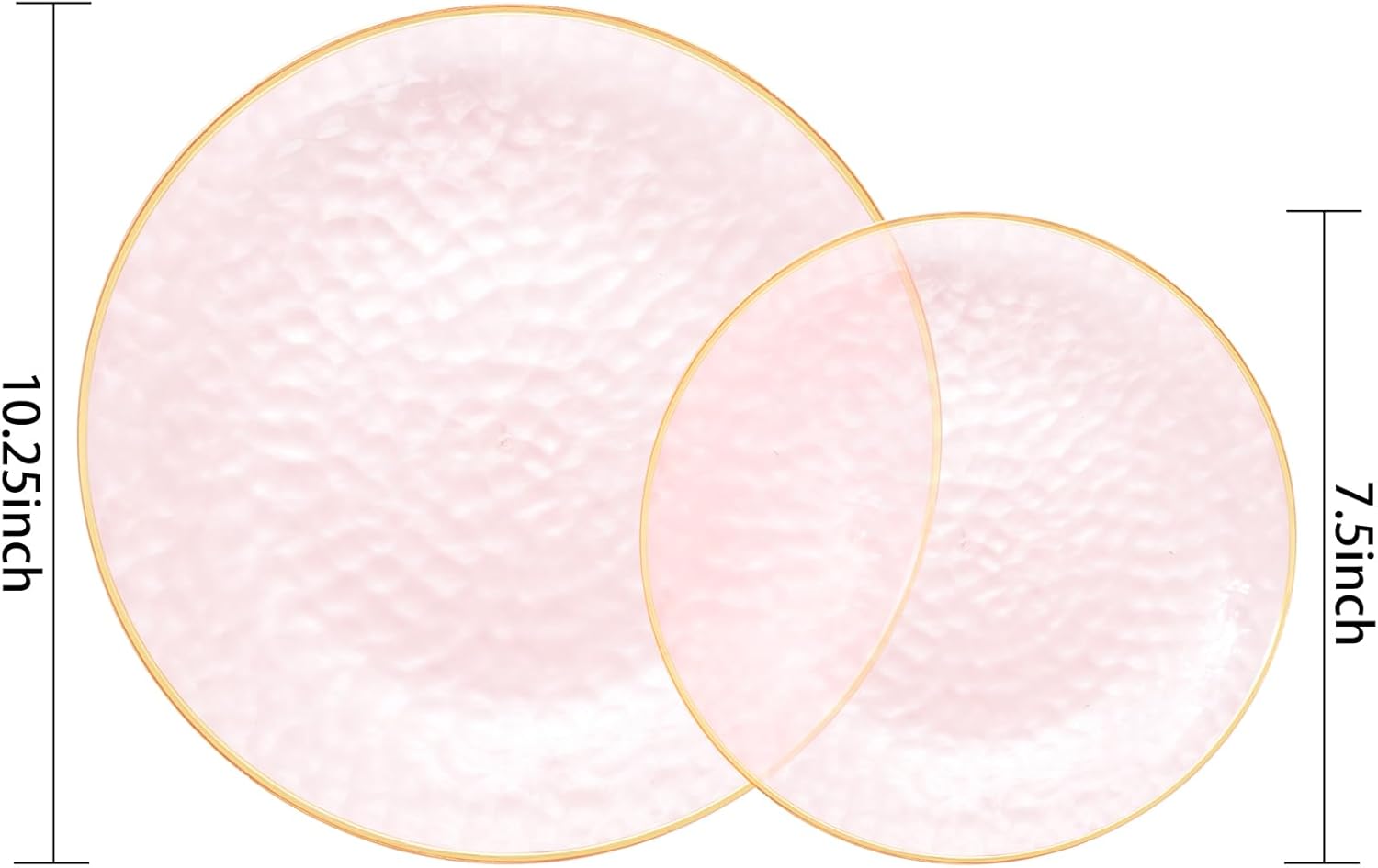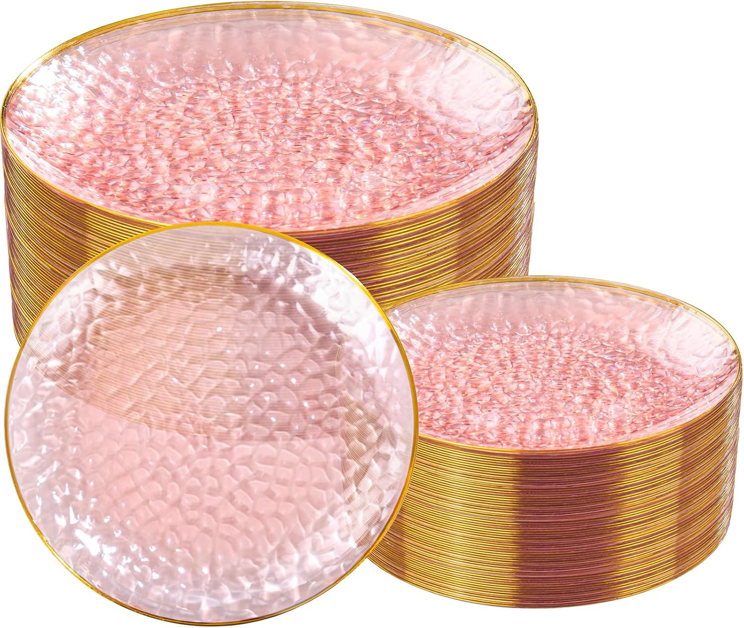 Rubtlamp 100Pcs Clear Pink Gold Plastic Plates, Pink Disposable Plates With Gold Rim, Hammered Plastic Plates Include 50 Clear Dessert Platos, 50 Dinner Platos for Party