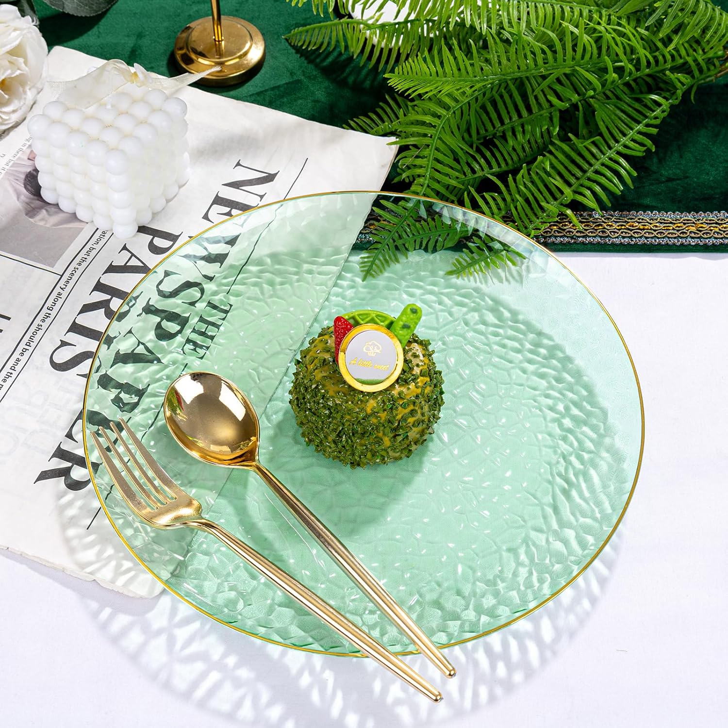 Rubtlamp 100 Clear Green Gold Plastic Plates, Hammered Clear and Gold Disposable Plates Include 50 Dessert Platos, 50 Dinner Platos for Party