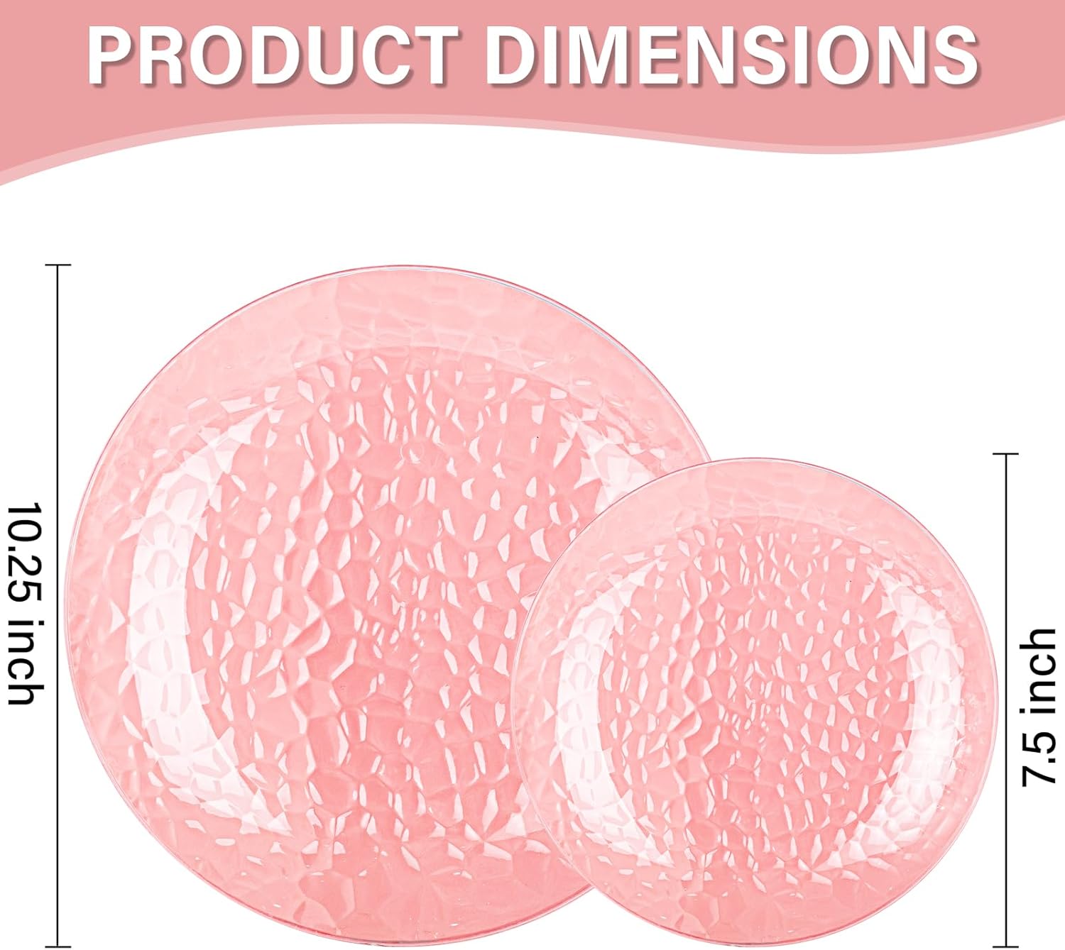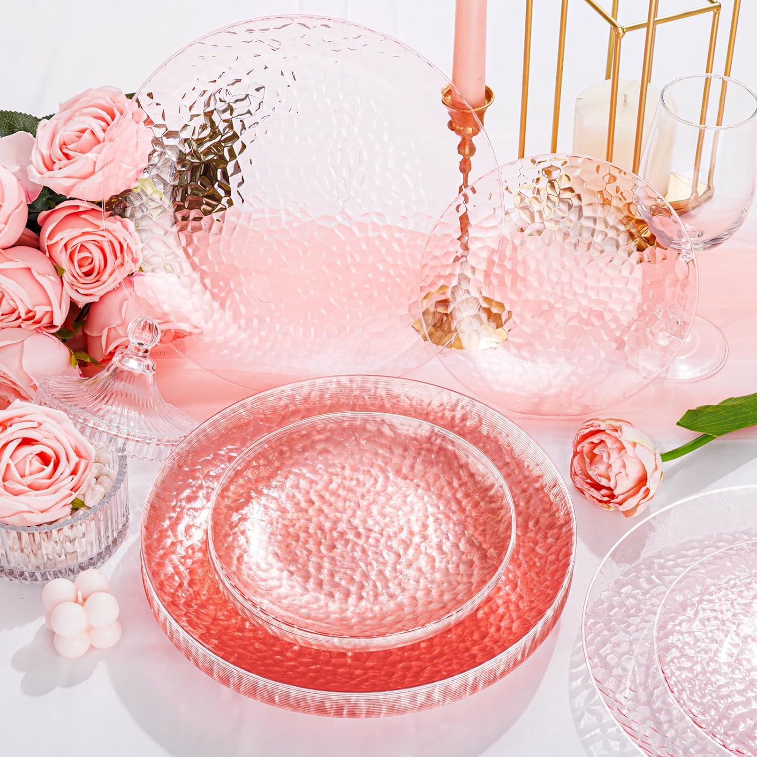 Rubtlamp 100 Pcs Clear Pink Plastic Plates Dinnerware Set, Hammered Plastic Pink Plates Set,Clear Disposable Party plates Include 50 Dinner Platos,50 Dessert Platos