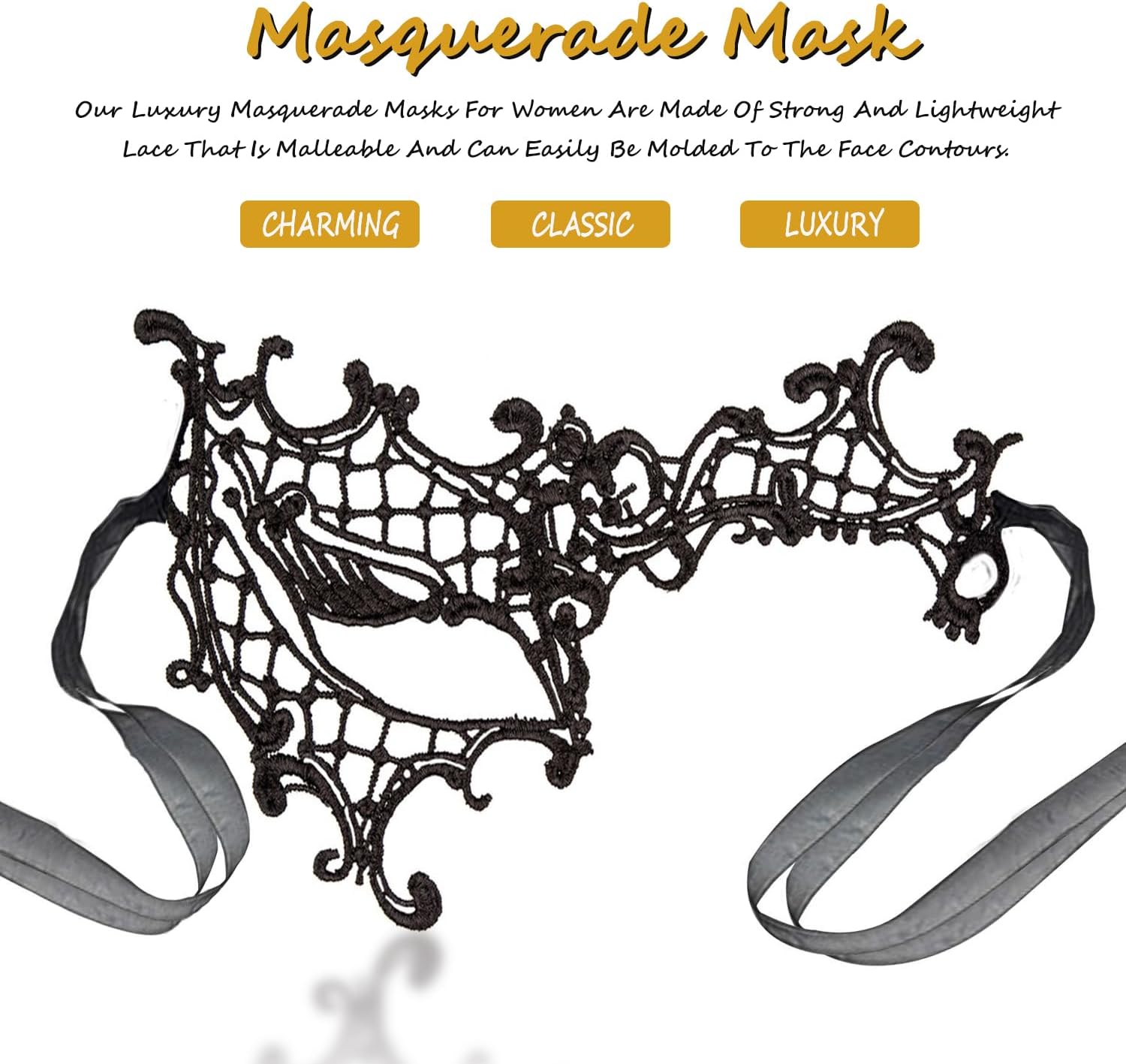 - HIGHGRADE MATERIAL : Our luxury masquerade masks for women are made of strong and lightweight lace that is malleable and can easily be molded to the contours of the wearers face.Most importantly,the classic black lace will not chip off or fad off,which is chic,intricate and absolutely gorgeous