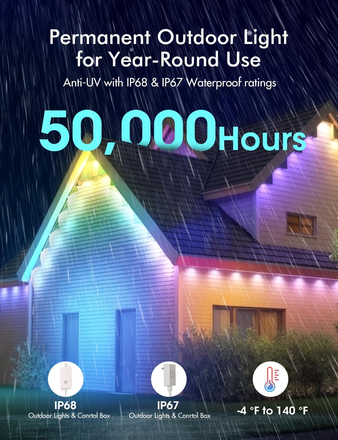 - 【All-Weather Durability】UV-resistant materials and flame-retardant wiring ensure the outdoor lights for house withstand rain, snow, and extreme temperatures (-4°F to 140°F). The outdoor led lights feature IP67 waterproof rating can use for up to 50,000 hours